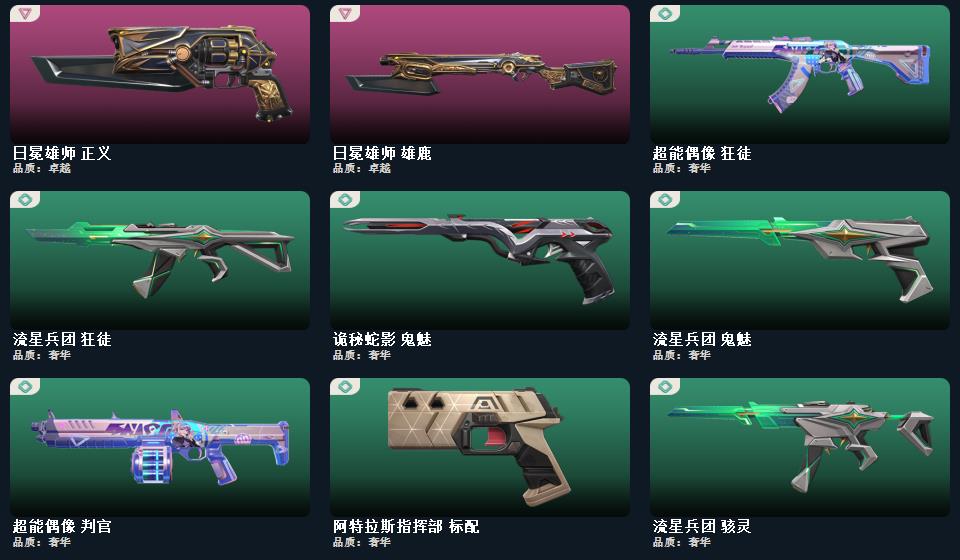 wegame无畏契约★武器皮肤数量:57,侦察力量 蝴蝶刀,埃芒迪尔大剑,流星兵团 短剑,落英飞旋,珍珠棘贝 短剑,星际猎兵 标配,聚合之力 蜂刺,采蜜小蜂队 獠犬,聚合之力 飞将,采蜜小蜂队 判官