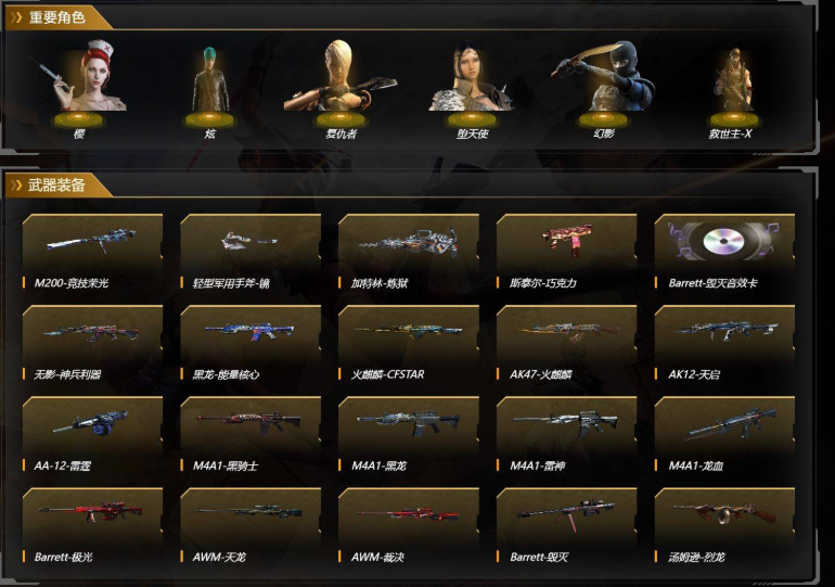【安徽一区/65V/vip1】【6烈龙/6修罗】【M200-竞技荣光】【M4A1-雷神】【雷霆之契】【Barrett-毁灭/Barrett-毁灭音效卡】【AK47-火麒麟/火麒麟-CFSTAR】【M4A1-黑骑士*2】【M4A1-黑龙/黑龙-能量核心】【无影-神兵利器】【AWM-天龙】【Barrett-极光*2】【AWM-裁决】【汤姆逊-烈龙*7】【加特林-炼狱*2】【沙鹰-修罗*7】【擎天-竞技荣光】【屠龙】【龙啸】【炫/紫霞/娟娟/潘多拉-X/救世主-X/幻影/堕天使/复仇者】【M4A1-龙血*2/M4A1-雷霆】【AA-12-雷霆/AK12-天启】【Colt 1911-大黄蜂/新USP-枪王排位奖励*4】【斩魔刀】【激光毁灭者III-白马银枪/冰龙粉碎者-白马银枪】【斯泰尔-巧克力/轻型军用手斧-镜】【M4A1-雷神-精英刀锋】【王者之影/王者之刺/王者之势】【高爆手雷-竞技荣光/闪光弹-竞技荣光*2/烟雾弹-竞技荣光*2】【高爆手雷-雷霆*5/闪光弹-雷霆*5/烟雾弹-雷霆*5】【炫金雷神/炫金毁灭】【超级护目镜/闪光护目镜/防弹头盔*7/防弹衣*7/C4工具钳*6/手雷包*5/防化服*3】;