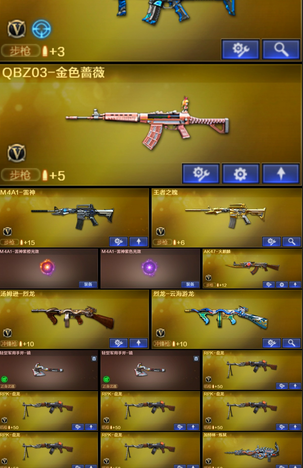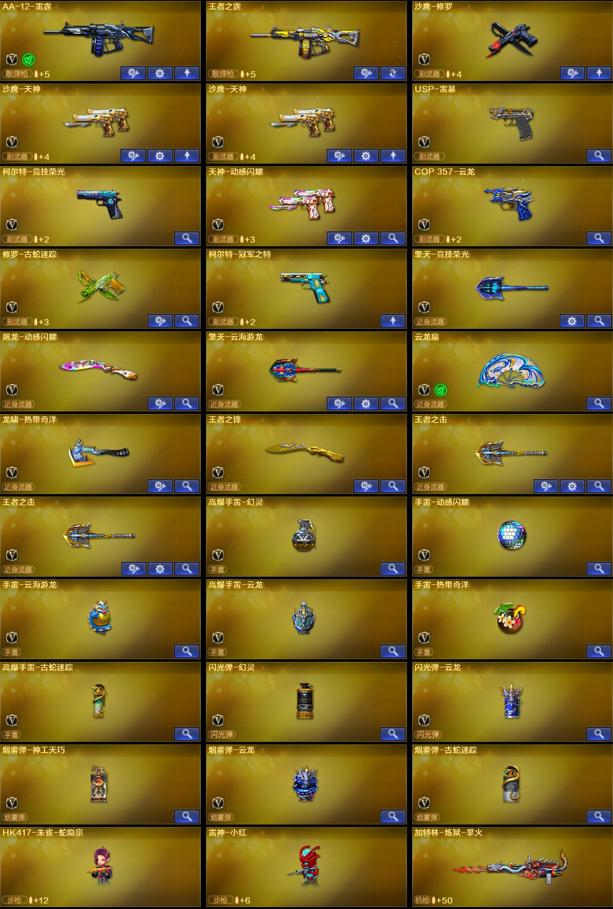 【稀有武器】:Kar98K-星神/USP-雷暴/柯尔特-竞技荣光/天神-动感闪耀/COP357-云龙/修罗-古蛇迷踪/柯尔特-冠军之特/金色蔷薇-古蛇迷踪/QBZ03-金色蔷薇/AK47-火麒麟/M4A1-雷神/白虎-电玩蓝兔/Barrett-毁灭/M200-竞技荣光/RPK-盘龙(6)/加特林-炼狱/悦蓝-惊涛骇浪-觉醒版/汤姆逊-烈龙/AA-12-雷霆/擎天-竞技荣光/云龙扇 【王者武器】:王者之魄-觉醒版/王者风神-觉醒版/王者之霆 【热门角色】:奇洋探员/乔伊教练/蛇隐宗/王者-葵-貂蝉/王者-零/王者-魅影/灵狐者-职业经理/潘多拉-X/幽 【热门音效卡】:Kar98K-星神音效卡/Barrett-毁灭音效卡 【其他亮点】:异变清道夫/金刚伞-电玩红兔;USP-雷暴,柯尔特-冠军之特,RPK-盘龙,QBZ03-金色蔷薇,Kar98K-星神,