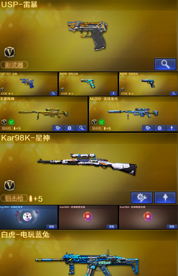 M200竞技荣光❤98K星神+音效卡❤白虎电玩蓝兔❤QBZ蔷薇❤USP雷暴❤柯尔特冠特❤COP云龙