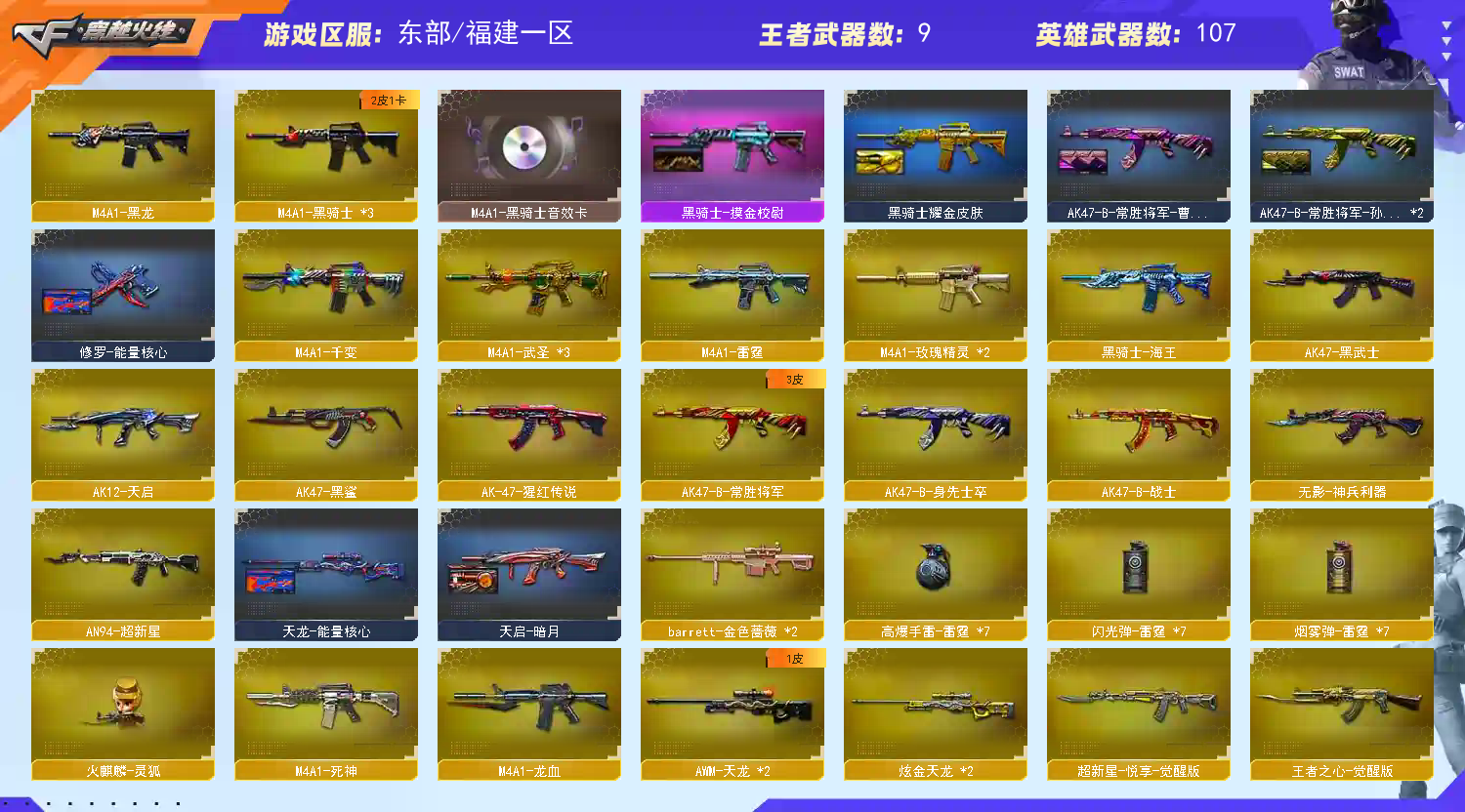 【福建一区/109V/vip1/1传说】【传说暗裔】【武圣套/6烈龙/6盘龙/6修罗】【M200-幻神/幻神-周瑜皮肤】【Scar Light-白虎】【QBZ03-金色蔷薇】【M4A1-雷神*2/M4A1-雷神音效卡/雷神-宇航兔皮肤/雷神-星空/雷神-暗月】【Glock18-武圣/雷霆之契】【Barrett-毁灭*3/Barrett-毁灭音效卡/毁灭耀金皮肤】【AK47-火麒麟*2/火麒麟-CFSTAR/火麒麟-心动糖果/火麒麟-平天大圣】【M4A1-黑骑士*3/M4A1-黑骑士音效卡/黑骑士-海王/黑骑士耀金皮肤】【M4A1-黑龙】【无影-神兵利器】【AK47-黑武士】【AWM-天龙*2/天龙-能量核心】【AWM-裁决*2】【M4A1-死神/M4A1-千变/M4A1-千变-孔明皮肤】【汤姆逊-烈龙*7】【RPK-盘龙*7】【加特林-炼狱*3/炼狱-悦蓝】【死亡之眼/迷你生化手雷*2】【沙鹰-修罗*11/修罗耀金皮肤/修罗-能量核心】【沙鹰-天神】【麒麟刺*2】【擎天】【屠龙*4】【龙啸*4】【炫/王者玲珑-小乔/王者-葵-貂蝉/龙儿/樱-青春偶像/兔囡囡/青霞仙子/斯沃特-X/影武者-X/铁骑荣耀/幻影/堕天使/复仇者】【M4A1-玫瑰精灵*2/M4A1-龙血/M4A1-雷霆/M4A1-武圣*3】【AK47-B-常胜将军/AK47-B-身先士卒/AK47-B-战士/AK-47-猩红传说】【AK47-黑鲨/AK12-天启/天启-暗月】【AN94-超新星/超新星-悦享】【Colt 1911-大黄蜂*2/新USP-枪王排位奖励*3】【神圣爆裂者-末日III/激光毁灭者III-白马银枪/激光毁灭者III*2/冰龙粉碎者-白马银枪/阐释者III】【斯泰尔-巧克力/轻型军用手斧-镜*4】【火麒麟-灵狐/迷你裂空之翼】【王者之心/王者之刺/王者之魄/王者之势/王者之锋/王者之击/王者之啸】【高爆手雷-雷霆*7/闪光弹-雷霆*7/烟雾弹-雷霆*7】【炫金雷神/炫金黑龙/炫金骑士/炫金天龙*2】【透明护目镜/超级背包/防弹头盔*2/防弹衣*2/C4工具钳*3/手雷包*3/防化服】;RPK-盘龙,QBZ03-金色蔷薇,M200-幻神,Scar Light-白虎,传说暗裔,