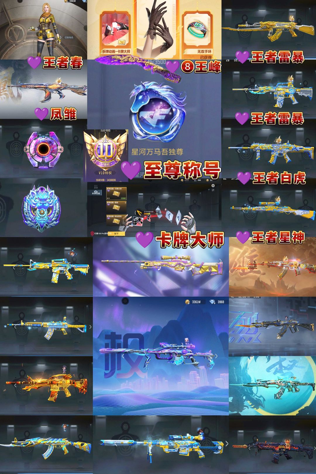 ❤️❤️❤️充值18888称号星河万马❤️❤️❤️ ❤️❤️❤️收藏版前300❤️❤️❤️ ❤️V10极品❶❹❺万V值❤️星象熔岩C4~江东骸虎C4❤️ ❤️王者春~王者葵~钟小葵~晴雅~云悠悠~雅典娜~步练师~ ❤️❽把王者之锋-紫电王锋~王锋熔岩皮~王锋拉丝皮 ❤️❽个背包配置页 ❤️王者雷暴AK至尊 ❤️王者雷暴M4至尊 ❤️王者白虎 ❤️王者星神 ❤️凤雏 ❤️M200权-江东骸虎~81瑜龙腾之力~本初深渊~仲达白露~元让过载~孟德绝影➕过载~奉先无双~仁德~定军~策江东骸虎 ❤️一线音效卡齐全,消灭音效和抢线很多 ❤️❼王烈仲康-黑龙魂-本初套装-宙斯-螳螂-雷霆王者大炮