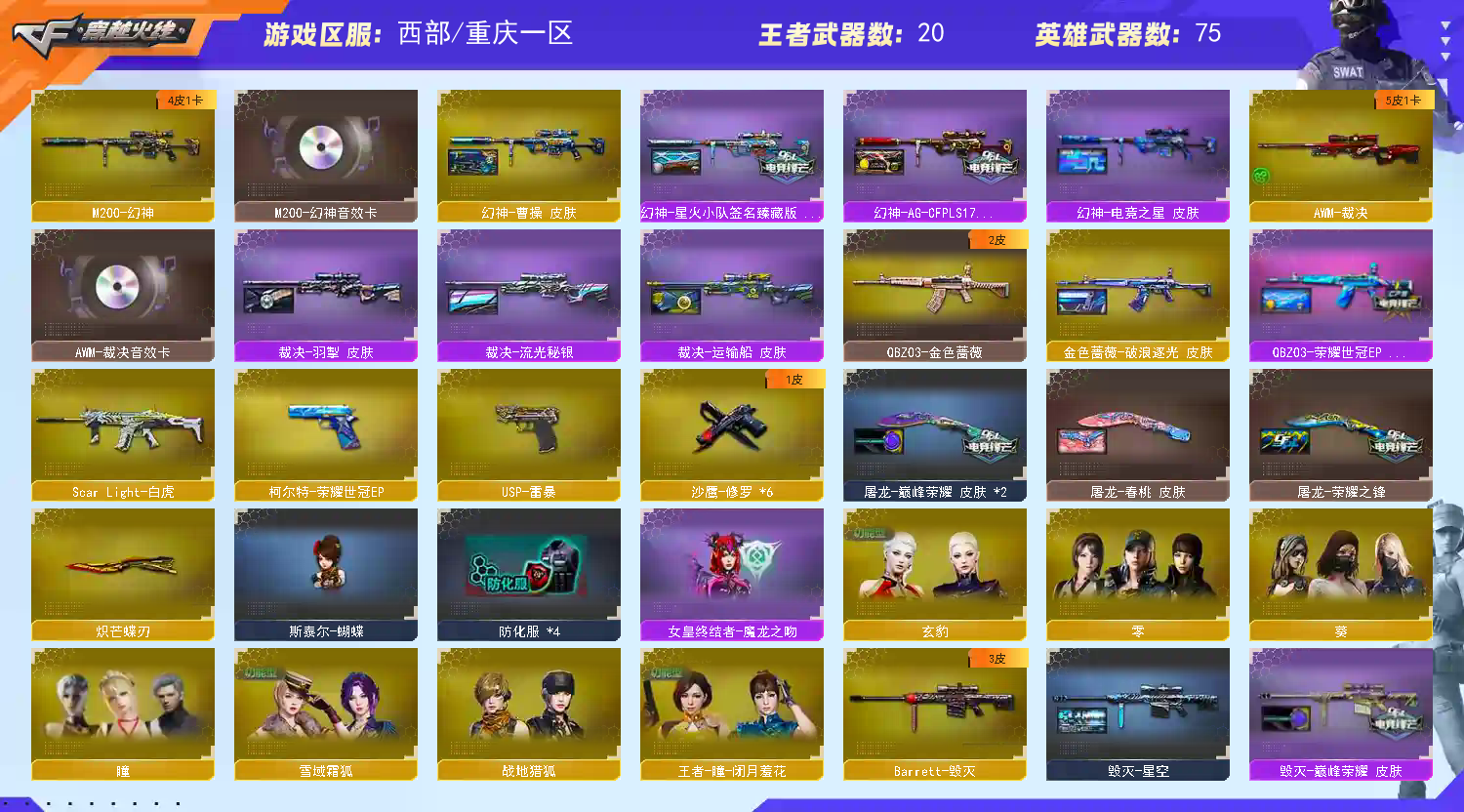【亮点解析 幻神4皮带卡 裁决三件套】【m200幻神+幻神音效卡+电竞之星+ag17冠军+曹操 +星火小队+usp雷暴】【王者星霆 】【scar白虎】【qbz金色蔷薇+荣耀世冠ep】【朱雀】【火麒麟】【黑龙+冠军之武】【雷神+卡+s18冠军+荣耀之魄】【黑骑士+卡】【毁灭+巅峰荣耀】【裁决+裁决音效卡 +流光秘银 】【炽芒蝶刃】【武器:海王 王者之魄 】【9手枪:修罗*6 usp雷暴 修罗 王者之魂 荣耀世冠柯尔特ep】【9刀具 :屠龙 龙啸 擎天 麒麟刺 斩神刀雷暴 竞技荣光 王者之啸】【7雷套:雷暴雷*4 夜魔雷 竞技荣光 玄豹雷】【小人枪:朱雀蛇隐宗 雷神精英刀锋 火麒麟灵狐 天龙曼陀罗 散热额好的 】【音效卡:幻神音效卡 裁决音效卡 雷神音效卡 黑骑士音效卡 】【角色:葵 零 瞳 玄豹 不败狙神 零纪元 王者瞳闭月羞花 】;USP-雷暴,炽芒蝶刃,QBZ03-金色蔷薇,M200-幻神,Scar Light-白虎,