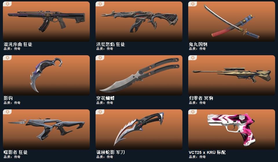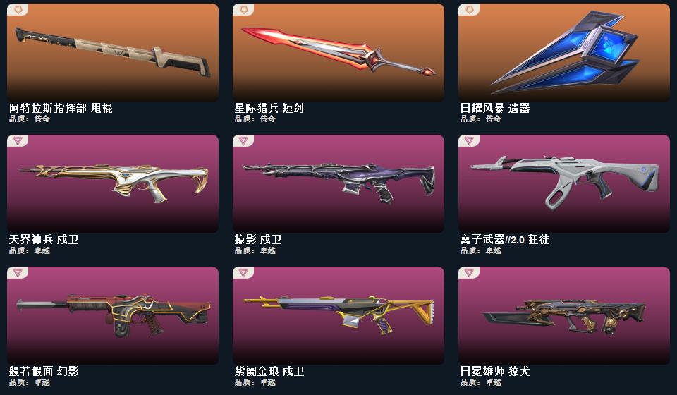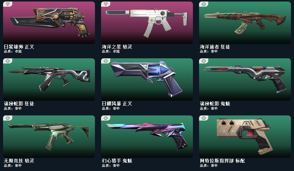 wegame无畏契约★武器皮肤数量:26,奇点 正义,星际猎兵 标配,阿特拉斯指挥部 标配,VCT25 x LEV 标配,日耀风暴 正义,折光棱晶 标配,末日之翼 短炮,诡秘蛇影 鬼魅,星云暗涌 鬼魅 无限竞技 骇灵,折光棱晶 蜂刺 盖亚的复仇 狂徒,诡秘蛇影 狂徒,折光棱晶 戍卫,末日之翼 幻影,虚空遗器 狂徒