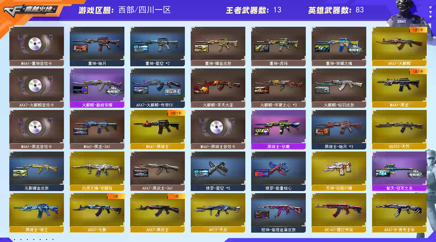 【亮点解析 幻神三件套 裁决带皮 】【m200幻神+音效卡+黄忠+荣耀世冠白鲨+usp雷暴】【98k星神】【烈龙*5 盘龙*2 炼狱 】【传说光耀(5752)】【传说夜影】【scar白虎】【qbz金色蔷薇】【qbz天罚 】【火麒麟+卡+even+巅峰荣耀】【黑龙+卡】【雷神+卡+荣耀之魄】【黑骑士+卡】【毁灭+卡+sv16冠军+ag15冠军】【裁决+羽掣】 【武器:白虎之魄 凤吟之魄 海王 】 【10手呛:修罗*6 雷暴 幻灵 竞技荣光 】 【11刀具:屠龙 龙啸*3 擎天 麒麟刺 尼泊尔雷霆 幻灵之峰 王者之啸 王者之刺 】 【7雷套:雷霆雷 幻灵雷*4 雷霆王者雷*2】 【小人呛:雷神小红 cop白鲨】 【音效卡:火麒麟音效卡 雷神音效卡 黑骑士音效卡 黑龙音效卡 幻神音效卡 毁灭音效卡 】 【四防角色:云悠悠 关小雨 王者春 】;USP-雷暴,电竞教官-云悠悠,RPK-盘龙,QBZ03-金色蔷薇,M200-幻神,Scar Light-白虎,Kar98K-星神,