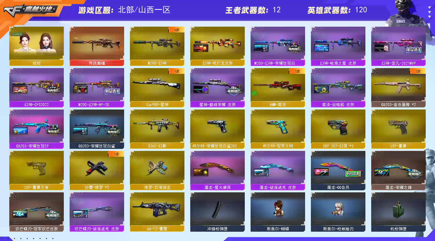 【山西一区】【幻神5皮】【斯泰尔-蝴蝶】【斯泰尔-枪娘暗刃】【炼狱-枪娘掣电】【雷霆套装X1套】【雷暴套装X7套】【幻灵套装X5套】【神工天巧套装X2套】【传说幽瞳】【M200-幻神】【幻神-宠儿-2021MVP】【M200-幻神-N9-2022MVP】【M200-幻神-荣耀世冠白鲨】【幻神-CFS2022】【幻神-纸灯龙皮肤】【Kar98K-星神】【星神-巅峰荣耀 皮肤】【王者星霆】【AWM-裁决】【裁决-胜者为王 皮肤】【王者白虎-觉醒版】【QBZ03-金色蔷薇】【QBZ03-荣耀世冠白鲨】【金色蔷薇-空】【G36C-幻影】【AK47-雷暴】【M4A1-神工天巧】【柯尔特-荣耀世冠白鲨2023】【USP-雷暴】【USP-雷暴王者】【柯尔特-冠军之特】【COP 357-幻灵】【炽芒蝶刃】【炽芒蝶刃-破浪逐光 皮肤】【炽芒蝶刃-冠军炽芒皮肤】【丛林匕首-玄豹】【炼狱-枪娘掣电】【加特林-炼狱】【炼狱-百战金芒】【斯泰尔-蝴蝶】【斯泰尔-枪娘暗刃】【USP-铃狮送福】【妮妮】【春】【奇洋探员】【乔伊教练】【蛇隐宗】【司雨】【王者春】【王者玲珑-小乔】【王者影豹】【王者岚兮儿】【隐】【鹰】【M4A1-雷神】【雷神-荣耀之魄】【雷神-宠儿-2019MVP】【M4A1-雷神-白鲨皮肤】【雷神-传奇N9】【雷神-暗月】【AK47-火麒麟】【AK47-火麒麟-传奇EVEN】【火麒麟-冠军之心】【火麒麟-荣耀世冠AG】【火麒麟-轻羽皮肤】【火麒麟-心动糖果】【火麒麟-CFSTAR】【M4A1-黑骑士】【黑骑士-虎牙平台皮肤】【黑骑士-冠军之势】【黑骑士-伏羲】【M4A1-黑龙】【黑龙-冠军之武】【Barrett-毁灭】【毁灭-冠军之怒】【巴雷特-毁灭-CFPL冠军】【毁灭-SV-CFPLS16冠军】【Barrett-毁灭音效卡】;USP-雷暴,USP-雷暴王者,柯尔特-荣耀世冠白鲨2023,柯尔特-冠军之特,炽芒蝶刃,妮妮,QBZ03-金色蔷薇,