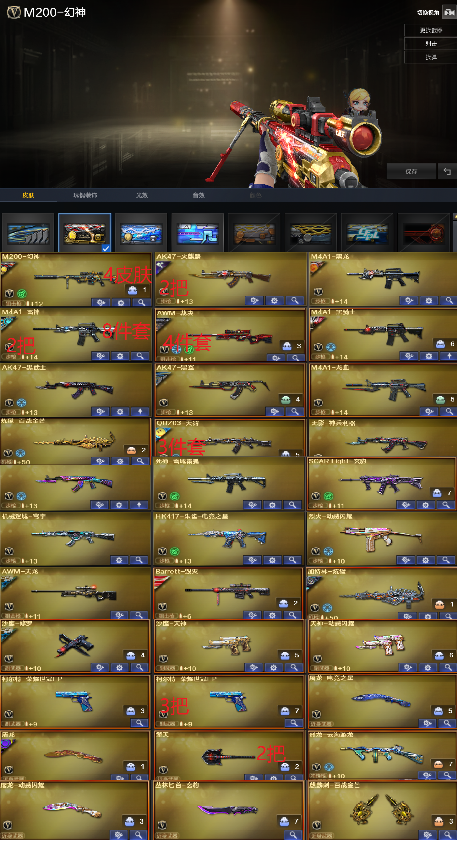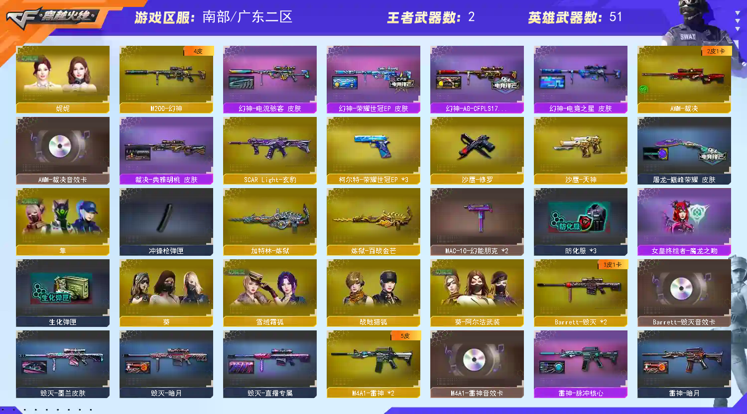 编号:GDA559南部广东二区✅爆破性价比✅四防妮妮+幻神6件套+裁决4件套+3把柯尔特荣耀世冠EP✅天罚3件套+雷神8件套✅炼狱百战金芒套 稀有武器:M200幻神、Scar玄豹、HK417朱雀电竞之星、火麒麟X2、雷神X2、黑龙、黑骑士X2、黑鲨、龙血、QBZ天罚、无影神兵利器、黑武士锦绣游龙、死神雪域霜狐、机械迷城穹宇、烈火动感闪耀、天龙、毁灭X2、炼狱百战金芒、炼狱、烈龙云海游龙、修罗、天神、天神动感闪耀、柯尔特荣耀世冠EPX3、屠龙、擎天X2、屠龙动感闪耀、丛林匕首玄豹、麒麟刺百战金芒、屠龙电竞之星、昌龙 稀有角色:妮妮(四防步枪自动装弹/免疫队友伤害/减少掉落伤伤/减少闪光伤害)、隼(四防佣兵觉醒/额外弹匣/生化觉醒/生化背包变更)、葵、迅捷虹喵、不败狙神、零纪元、战地猎狐、幻面灵狐、葵阿尔法武装、奇洋探员、乔伊教练、修道士、雪域霜狐 音效卡:天罚音效卡、死神雪域霜狐怀旧音效卡、极光音效卡、朱雀电竞之星竟星悦动音效卡、裁决音效卡、炼狱百战金芒庆典舞曲音效卡、AN94竞魂超新星音效卡X2、屠龙电竞之星竟星悦动音效卡、修罗盛典舞曲音效卡、昌龙怀旧音效卡、毁灭音效卡、雷神音效卡 稀有皮肤:幻神电竞之星皮肤/荣耀世冠EP皮肤/AGPLS17冠军皮肤/电流骇客皮肤、毁灭枪娘格雷姐妹皮肤/墨兰皮肤/ZHI播专属皮肤/暗月皮肤/英雄计划皮肤、天罚课桌奇兵皮肤、雷神脉冲核心皮肤/能量核心皮肤/战神赵云皮肤/源计划2.0专属皮肤/暗月皮肤/M4A1再燃战线、黑鲨电流骇客皮肤、火麒麟心动糖果皮肤/CF STAR皮肤X3、屠龙巅峰荣耀皮肤、炼狱月皮肤、裁决典雅胡桃皮肤/胜者为王皮肤 王者武器:王者猎神、炫金骑士 小人枪及特殊武器:火麒麟零纪元、M82水枪不败狙神、轻型军用手斧再燃战线、KAC锯式机枪黑桃战神、仓雷X2、AWM灵狐15周年嘉年华、魔能飞环曼陀罗X2、 投掷武器及套装:玄豹套、音乐手雷X4、烟雾弹荣耀世冠EP、凤凰之息X5;隼,妮妮,M200-幻神,