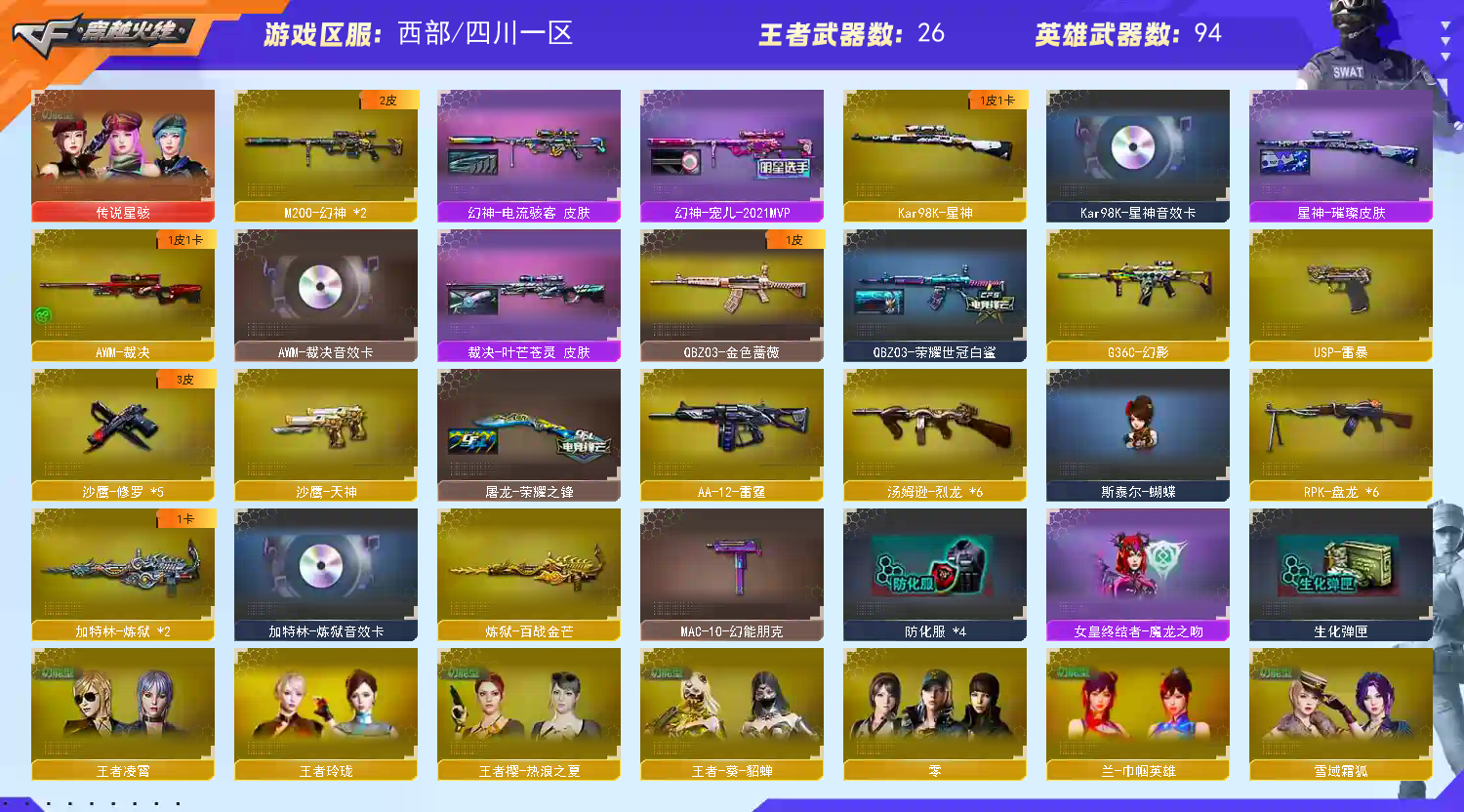 【亮点解析 传说角色 星神三件套 裁决三件套 生化满配 】【传说星骇】【m200幻神+电流骇客+宠儿+usp雷暴】【98k星神+音效卡+璀璨】【王者幻神 王者风神 】【6盘龙 炼狱+卡 6烈龙 斯太尔蝴蝶 】【g36c幻影】【白虎之魄】【qbz金色蔷薇+荣耀世冠白鲨】【朱雀 】【火麒麟+巅峰荣耀】【黑龙】【雷神+卡+冠军之魄+荣耀之魄+宠儿+n9+s18冠军】【黑骑士+冠军之势 】【毁灭+卡+冠军之怒】【极光+卡】【裁决+卡+叶芒苍灵 】【武器:王者之翼 王者之魄 王者之幻 】【7手枪:修罗*5 天神 雷暴 】【15刀具:屠龙*5 龙啸 擎天 麒麟刺 斩神刀雷暴 王者之锋 王者之啸 王者之击 夜魔 】【7雷套:雷暴雷*5 夜魔雷 云龙雷】【小人枪:毁灭孙三炮 cop白鲨】【音效卡:炼狱音效卡 星神音效卡 毁灭音效卡 裁决音效卡 雷神音效卡 极光音效卡 】【四防角色:王者葵貂蝉 王者凌霄 职业经理 】;USP-雷暴,传说星骇,RPK-盘龙,QBZ03-金色蔷薇,G36C-幻影,M200-幻神,Kar98K-星神,