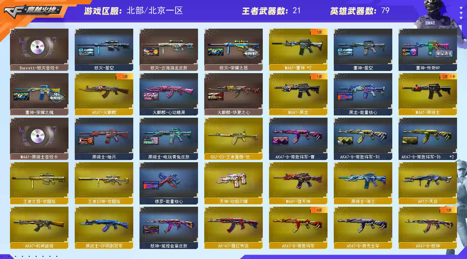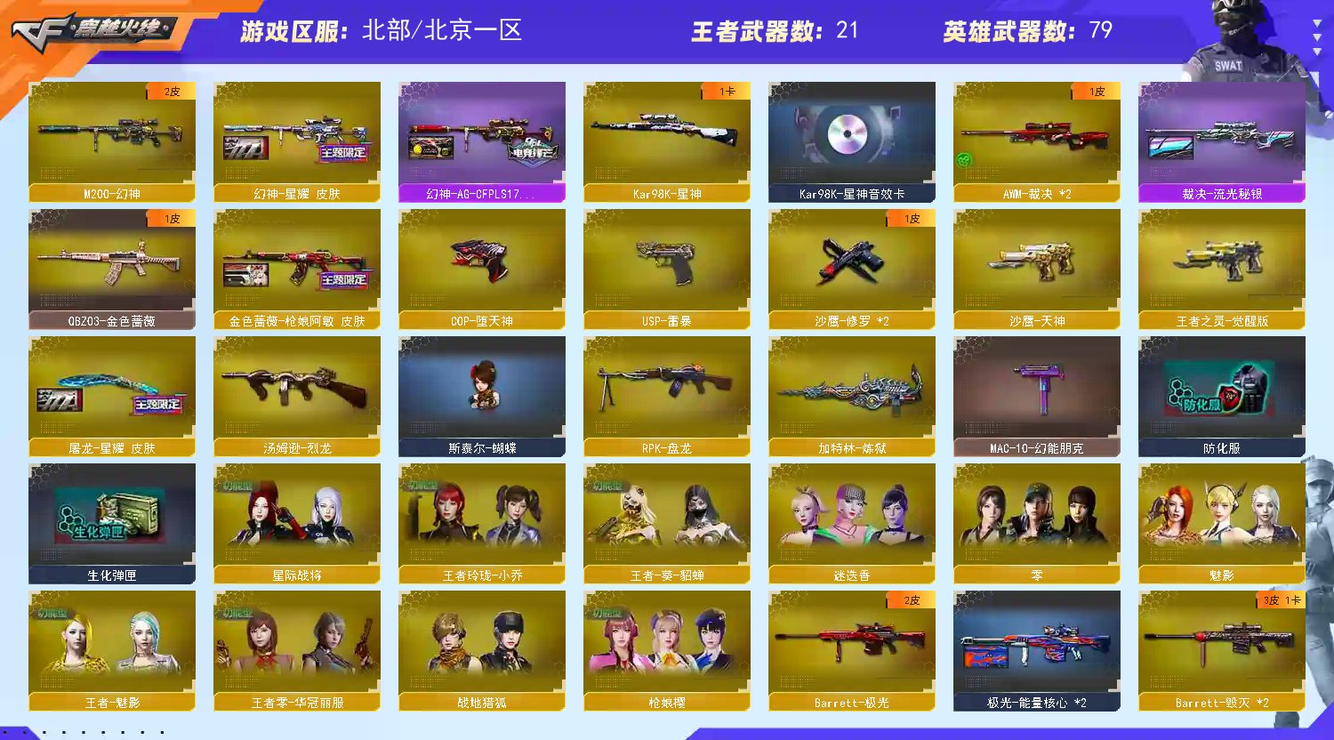 【m200-幻神+幻神-星耀+幻神-ag17冠军】 【98k星神+音效卡】 【王者幻神】 【qbz金色蔷薇】 【火麒麟】 【黑龙】 【雷神+雷神-传奇n9+雷神-荣耀之魄】 【黑骑士+音效卡】 【毁灭+音效卡】 【极光】 【裁决】 【王者之心 王者之魄 王者之势 王者炎心 王者之怒 】 【天启 超新星 机械迷城 龙血】 【9手呛 修罗*2 天神 usp雷暴 cop堕天神 王者之灵】 【16近战 屠龙*3 龙啸 擎天 麒麟刺 斩神刀雷暴 王者之锋 王者之啸 王者之击*2 王者之刺】 【手雷 雷暴雷*4 堕天神*5】 【四防 王者葵貂蝉 王者魅影 王者玲珑小乔 职业经理】 【动感闪耀炫彩背包 炫彩背包 edg炫彩背包】;USP-雷暴,RPK-盘龙,QBZ03-金色蔷薇,M200-幻神,Kar98K-星神,