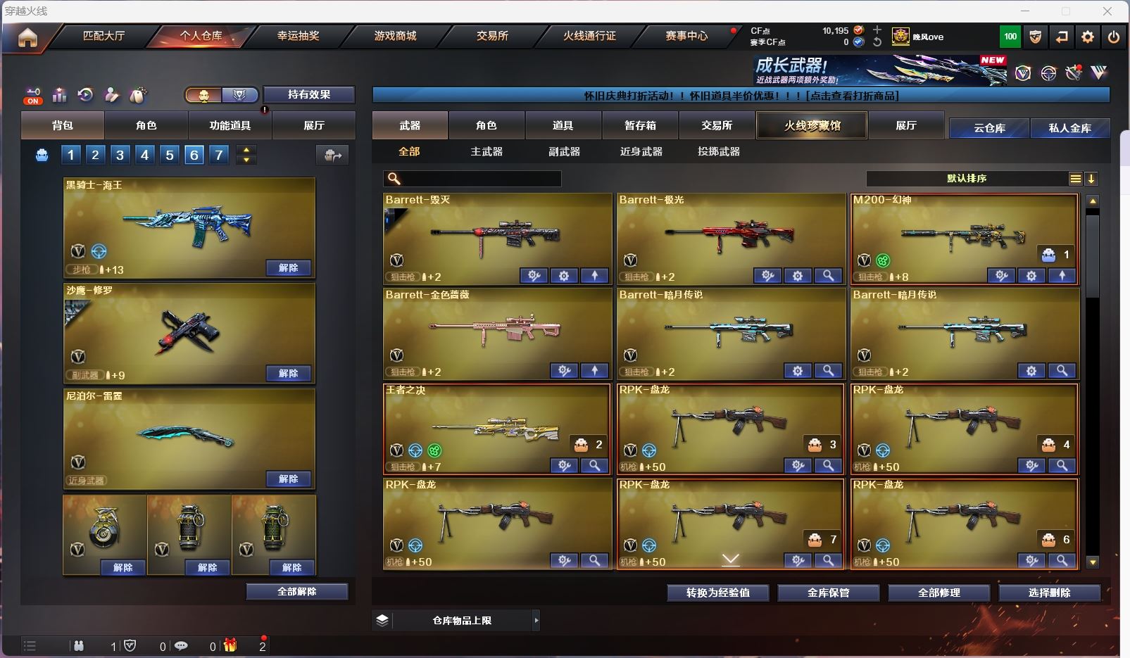【m200幻神+usp雷暴】【6盘龙 炼狱 6烈龙 炼狱小刚 6黑骑士 斯太尔蝴蝶 】【scar白虎+暗星】【qbz金色蔷薇】【火麒麟】【雷神】【黑骑士+卡+白马银枪】【毁灭】【极光】【武器:夜魔 幻灵 神工天巧】【9手枪:修罗*2 天神*2 雷暴 夜魔 幻灵*2 王者之魂 】【12刀具:屠龙 龙啸 擎天 麒麟刺 尼泊尔雷霆 斩神刀雷暴 夜魔 幻灵之峰 王者之锋 王者之啸 王者之击 王者之刺 】【12雷套:雷霆雷 雷暴雷*4 夜魔雷*7】【小人枪:火麒麟灵狐 雷神小红 炼狱小刚 】【音效卡:黑骑士音效卡 】【四防角色:凌霄 影豹 王者春 王者葵貂蝉 王者魅影 】;