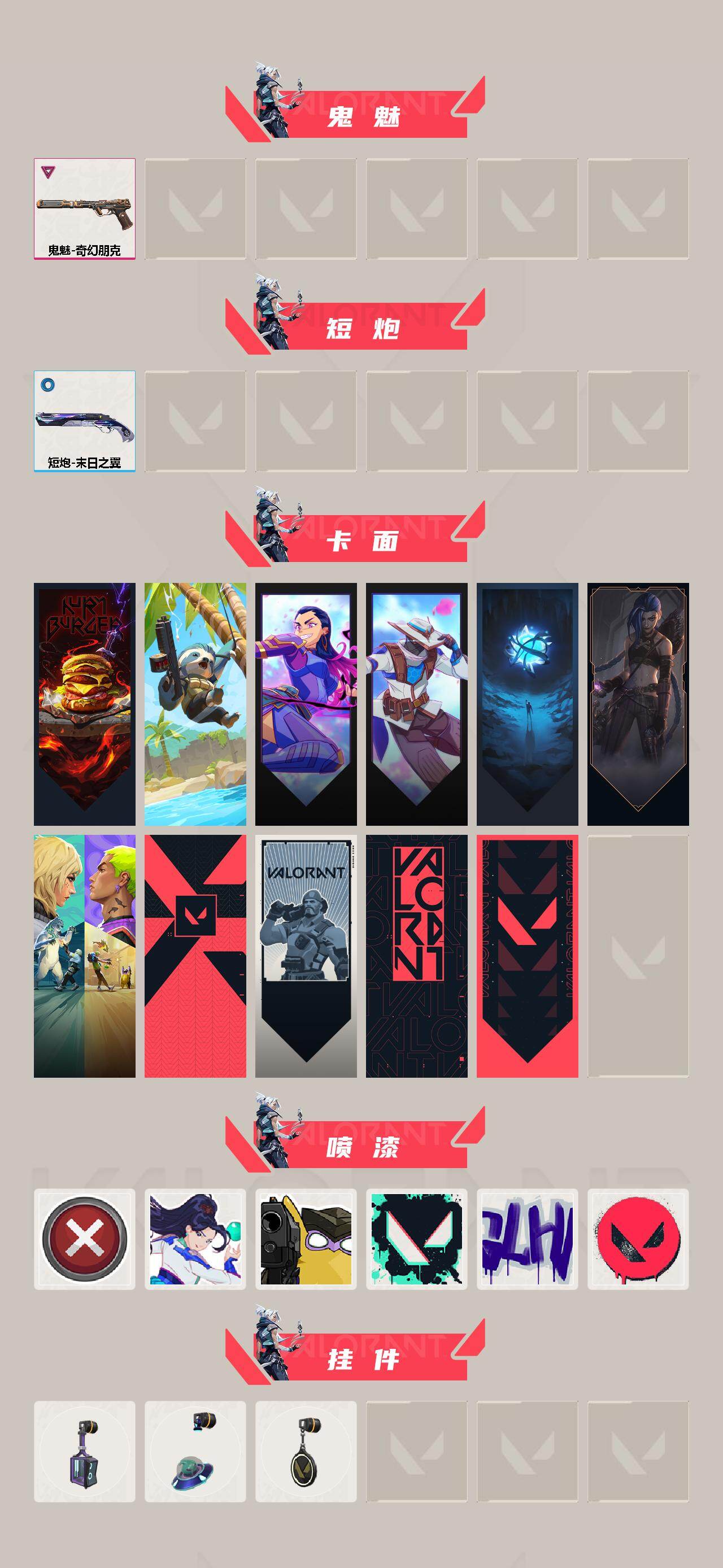 【英雄】:幻棱,炼狱,暮蝶,壹决,铁臂,捷风,雷兹,幽影,不死鸟,贤者,猎枭,零,芮娜,尚勃勒,霓虹,斯凯,夜露,星礈,K/O,海神,盖可,黑梦 【近战武器】:近战武器-5周年//公测重制版 苍龙之刃,近战武器-盖亚之怒,近战武器-日耀风暴 遗器 【狂徒】:狂徒-超时空卫队,狂徒-掠影,狂徒-离子武器//2.0,狂徒-诡秘蛇影 【幻影】:幻影-源能者危机001 【戍卫】:戍卫-紫阙金琅,戍卫-折光棱晶 【冥驹】:冥驹-堕天遗武 【飞将】:飞将-末日之翼 【莽侠】:莽侠-诡秘蛇影 【奥丁】:奥丁-末日之翼 【判官】:判官-诡秘蛇影 【骇灵】:骇灵-无限竞技 【蜂刺】:蜂刺-橙色疾影,蜂刺-折光棱晶 【标配】:标配-折光棱晶 【正义】:正义-奇点 【鬼魅】:鬼魅-奇幻朋克 【短炮】:短炮-末日之翼 【卡面】:激斗汉堡 卡面,树懒大作战 卡面,无畏契约GO!一卷:芮娜 卡面,无畏契约GO!一卷:零 卡面,无垠星环 卡面,《双城之战》金克丝 卡面,钢锁vs盖可 卡面,代号红色 卡面,新兵报到 卡面,V契约 卡面,无畏契约 卡面,#拯救宽体奇乐 卡面 【喷漆】:买装还是存钱 喷漆,无畏契约GO!一卷:贤者 喷漆,放下武器 喷漆,胜利属于无畏契约 喷漆,GLHF 喷漆,无畏契约 喷漆 【挂饰】:动力机箱 挂饰,天外飞客 挂饰,无畏契约 纪念币 挂饰;5周年//公测重制版 苍龙之刃,掠影 狂徒,离子武器//2.0 狂徒,堕天遗武 冥驹,奇点 正义,
