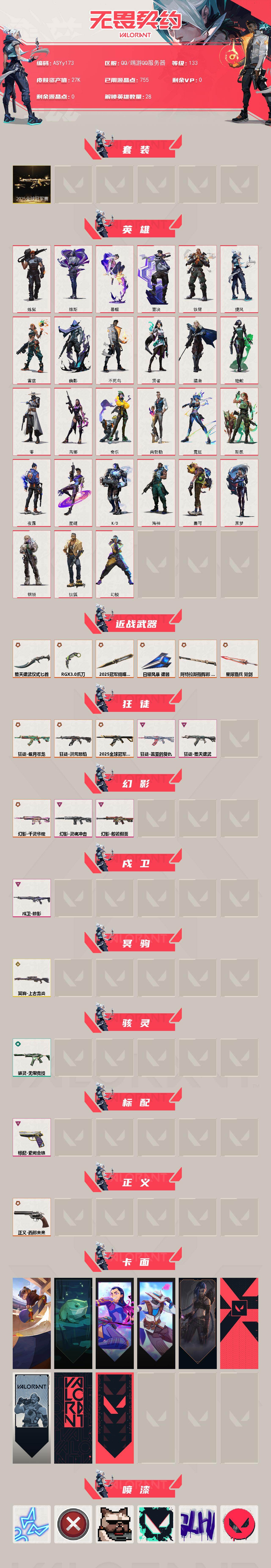 冻结三分钟内解除,短信通知重新上即可!喜欢收藏不迷路、游戏异常进小黑屋、时间不够请提前续租或者不要开局 【套装】:2025全球冠军赛套装 【英雄】:幻棱,炼狱,维斯,暮蝶,钛狐,壹决,铁臂,捷风,雷兹,幽影,不死鸟,贤者,猎枭,蝰蛇,零,芮娜,奇乐,尚勃勒,霓虹,斯凯,夜露,星礈,K/O,海神,盖可,黑梦,钢锁 【近战武器】:近战武器-2025全球冠军赛 蝴蝶刀,近战武器-RGX 11z Pro//3.0 爪刀,近战武器-堕天遗武 仪式匕首,近战武器-日耀风暴 遗器,近战武器-阿特拉斯指挥部 甩棍,近战武器-星际猎兵 短剑 【狂徒】:狂徒-2025全球冠军赛,狂徒-洪荒怒焰,狂徒-偃月苍龙,狂徒-堕天遗武,狂徒-盖亚的复仇 【幻影】:幻影-千灵华绽,幻影-般若假面,幻影-灵魂冲击 【戍卫】:戍卫-掠影 【冥驹】:冥驹-上古龙炎 【骇灵】:骇灵-无限竞技 【标配】:标配-紫阙金琅 【正义】:正义-西部未来 【卡面】:Clutch 卡面,霓帧牛蛙 卡面,无畏契约GO!第卷:芮娜 卡面,无畏契约GO!一卷:零 卡面,《双城之战》金克丝 卡面,代号红色 卡面,新兵报到 卡面,V契约 卡面,无畏契约 卡面 【喷漆】:霓光四射 喷漆,买装还是存钱 喷漆,关门放狗 喷漆,胜利属于无畏契约 喷漆,GLHF 喷漆,无畏契约 喷漆 【挂饰】:无畏契约GO!第卷 零 挂饰,天外飞客 挂饰,无畏契约 纪念币 挂饰;