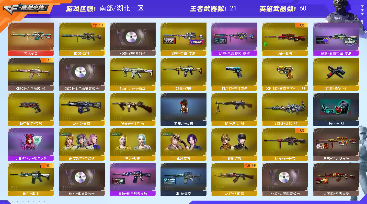 传说圣灵/幻神2皮三件套/星耀皮肤/电流骇客/幻神音效卡】【王者星神/G36C幻影/白虎/QBZ金色蔷薇带QBZ音效卡】【2把COP雷霆王者+柯尔特竞技荣光】【6烈龙+5盘龙+2炼狱+斯泰尔蝴蝶】【稀有角色云悠悠/王者魅影/透明护目镜/超级背包】【雷神星空皮肤/雷神音效卡三件套】【雷神虎将皮肤】;电竞教官-云悠悠,RPK-盘龙,QBZ03-金色蔷薇,G36C-幻影,M200-幻神,Scar Light-白虎,