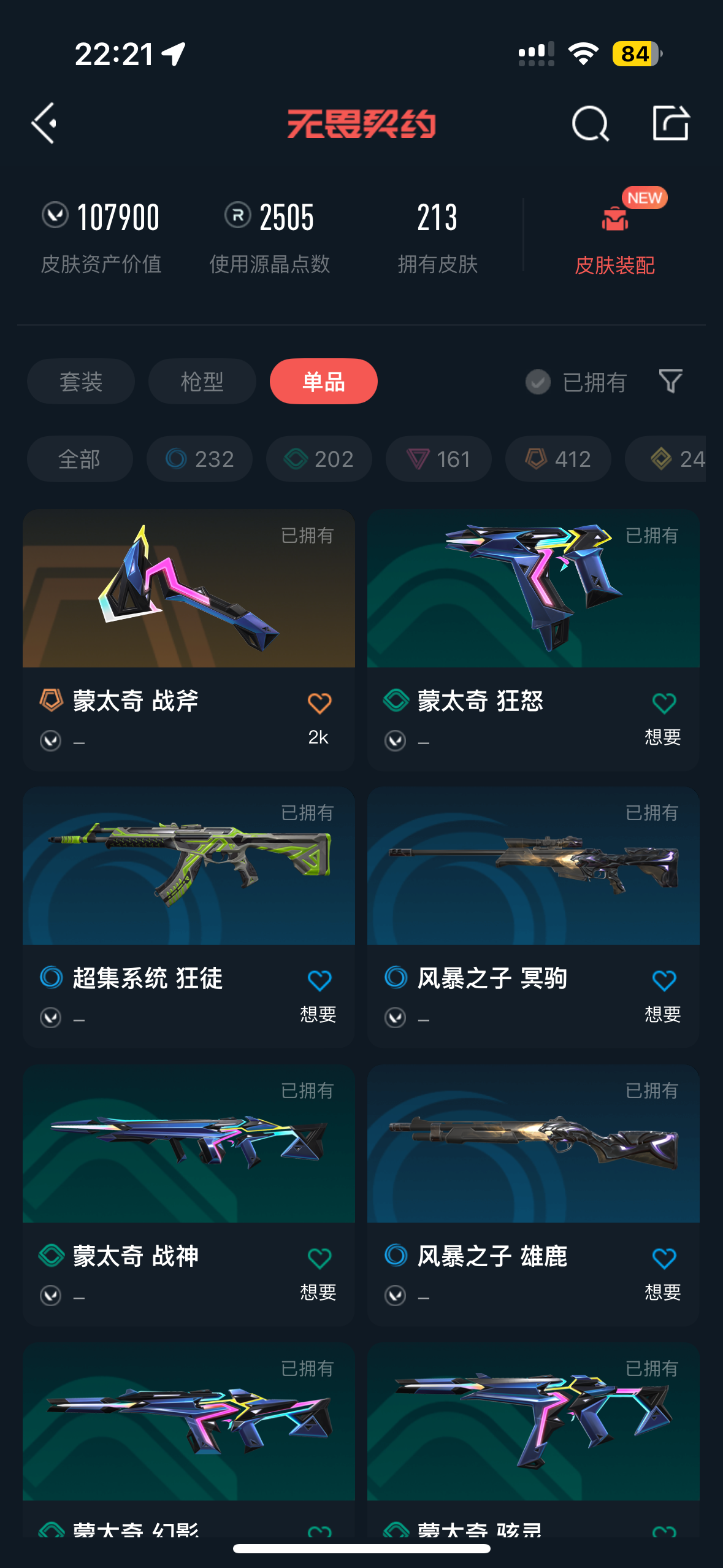 可排位 英雄28 武器皮肤数量213;黑波之刃,威龙之刃,VCT 2025 爪刀,盖亚的复仇 狂徒,掠影 狂徒,侦察力量 幻影,紫阙金琅 狂徒,