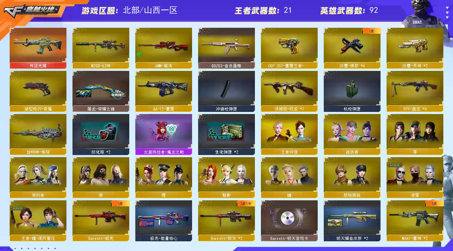 北部高端极品 138V可排🔥幻神+传说光耀+朱雀等🔥传奇N9荣耀冠军SV轻羽皮🔥四防+全夜魔+网剧冠军+冰魄【山西一区登录】【炫金稀有顶1V介意者勿租】【恶意投诉、撤单不想玩了租错号了等非帐号问题1律拉黑】【此号已备案请勿以身试法】 【重要套装】网剧冠军套装/夜魔套装/四防角色 【重要角色】_瞳/魅影/审判者/_凌霄/_零/_迷迭香/_葵/_樱/王者玲珑/王者-瞳-闭月羞花/雅典娜 【传说武器】传说光耀 【英雄武器】_M200-幻神/王者幻神-觉醒版/Barrett-毁灭(2)/Barrett-极光/AWM-天龙(3)/AWM-裁决/M4A1-青龙(2)/M4A1-雷神(2)/M4A1-龙血/M4A1-千变/M4A1-黑骑士(2)/M4A1-夜魔(2)/M4A1-玫瑰精灵/王者之魄-觉醒版/HK417-朱雀/AK12-天启(4)/AK47-火麒麟(4)/AK47-无影(2)/AK47-黑鲨(2)/AK47-黑武士/黑武士-CF网剧冠军/AK47-B-战士/AK47-B-战神/QBZ03-金色蔷薇/9A91-烈火(3)/RPK-盘龙(6)/汤姆逊-烈龙(7)/烈龙-悦心-觉醒版/AA-12-雷霆/加特林-炼狱/COP 357-雷霆王者-觉醒版/沙鹰-天神(2)/天神-CF网剧冠军/沙鹰-修罗(4)/破空枪刃-夜魔/龙啸/王者之啸-觉醒版(2)/擎天-CF网剧冠军/屠龙(3)/马来剑-夜魔/高爆手雷-夜魔(7)/烟雾弹-夜魔(7)/闪光弹-夜魔(7)/龙啸-烈火龙威 【王者武器】王者之势(2)/王者之鲨/王者之城/王者之影/王者冰魄/王者之决/炼狱-悦蓝/王者之灵/王者之锋(2)/王者之击 【小人枪】火麒麟-灵狐/闪光弹-小乔 【其他重要武器】炫金雷神/炫金骑士/炫金毁灭/炫金修罗(3)/M4A1-仙界-黑骑士/HK417-赤血龙魂/AK47-苍龙/M4A1-秘银赤龙(5)/AK47-破空冰刃(2)/黄金AK-47/雷蛇AWM/黄金AWM/Barrett-捣乱兔兔/AWM-A-圣诞2021/愤怒公牛左轮-枪王排位/新USP-枪王排位奖励(4)/沙鹰-枪王排位(2)/COP-金蝉子-枪王排位/新USP-怒火大圣/Anaconda-雷电核心/COP357-十二生肖·羊/幻影Anaconda-枪王排位/迷彩沙鹰-70KG/蝴蝶刀-枪王排位/虹光丛林匕首-枪王排位/闪光弹-枪王排位(2) 【重要武器皮肤】极光-能量核心/毁灭耀金皮肤/巴雷特SV皮肤/雷神-传奇N9/雷神-耀金皮肤/黑骑士-地狱火/黑骑士耀金皮肤/黑龙-能量核心/火麒麟-CFSTAR/火麒麟-轻羽皮肤/战神-粉色甜心皮肤/修罗-星空/修罗耀金皮肤/屠龙-荣耀之锋 【重要光效】王者之幻金色光效/王者之影金色光效/王者之魂金色光效/AWM-天龙蓝色光效/RPK-盘龙蓝色光效/沙鹰-修罗蓝色光效/AK47-火麒麟蓝粉色光效/沙鹰-修罗红绿色光效/M4A1-雷神紫橙光效/王者之势紫色光效/M4A1-黑骑士绿色光效 【重要音效卡】M4A1-黑骑士音效卡/火麒麟音效卡/毁灭音效卡/雷神音效卡 【重要戒指】龙眼(鹰)/16赛季纪念戒指-枪王耀银/17赛季纪念戒指-耀金/18赛季纪念戒指-耀金/20赛季纪念戒指-耀金/21赛季纪念戒指-耀铜(食指)/21赛季纪念戒指-耀银(拇指)/22赛季纪念戒指-耀银(拇指)/23赛季纪念戒指-耀铜(食指)/23赛季纪念戒指-耀银(拇指)/24赛季纪念戒指-耀铜(食指)/24赛季纪念戒指-耀银(拇指);RPK-盘龙,QBZ03-金色蔷薇,M200-幻神,