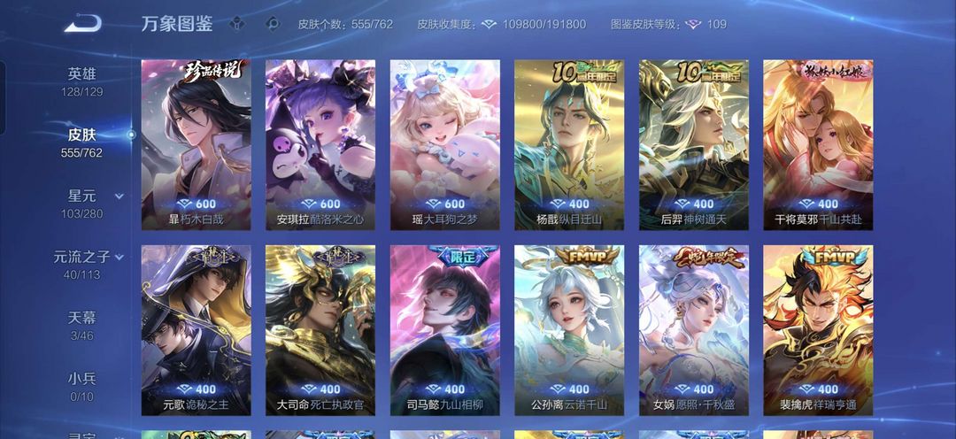 V10、550皮14水、吕布典藏-千魇归渊、云缨-神骥·越千峰、怪盗基德、伽罗星传说红枫、瑶典藏拾光映像、冥王哈迪斯、、龙年限定、齐天大圣