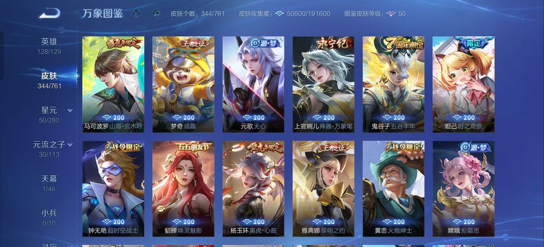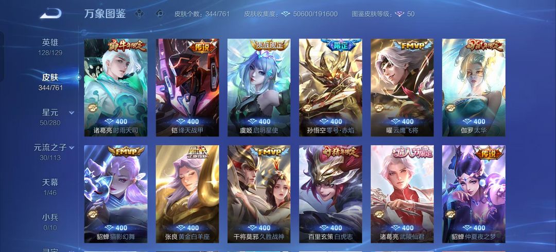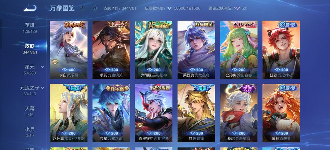 344皮肤-青丘九尾,星域神启,愿照千秋盛,曦玄引,遇见胡旋,游龙青影,李逍遥,武陵仙君,白虎志,凤