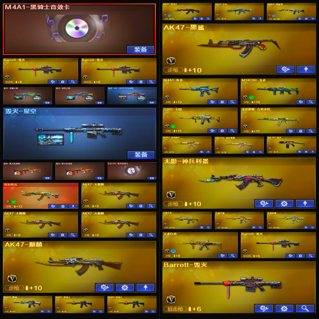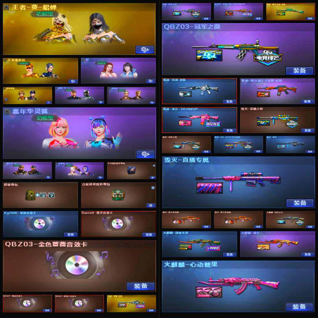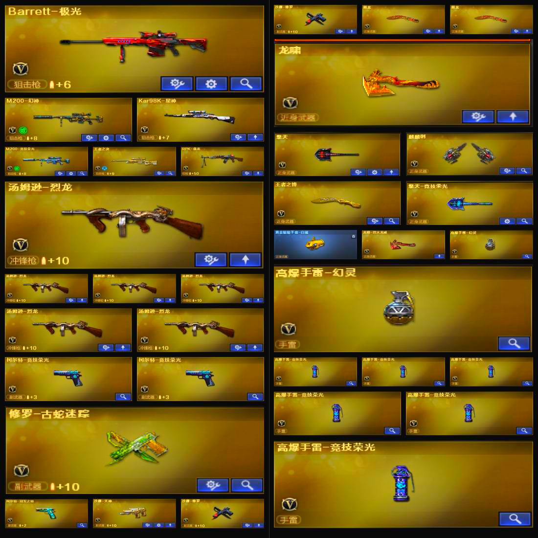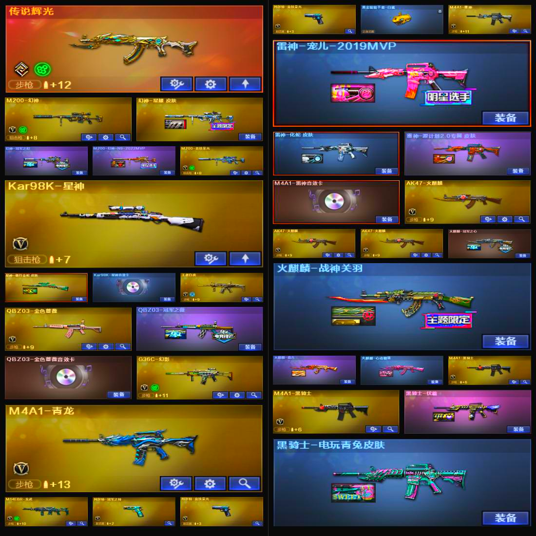 【亮点解析 星神三件套 幻神3皮 生化高配 】【m200幻神+星耀+n9皮肤+冠军之幻+冠军之特】【98k星神+音效卡+傲竹金蛇 】【m200竞技荣光套+云悠悠 】【6烈龙 盘龙 死亡之眼 】【传说辉光】【g36c幻影】【王者白虎】【qbz金色蔷薇+卡+冠军之薇】【玄武 】【火麒麟+冠军之心】【雷神+卡】【黑骑士+卡】【毁灭+卡+ag15冠军 +冠军之怒+荣耀之怒】【极光】 【武器:青龙 王者之武 王者之魄 王者冰魄 】 【7手呛:修罗*3 竞技荣光*2 天神 】 【7刀具:屠龙*2 龙啸 擎天 王者之锋 麒麟刺 竞技荣光 】 【雷套:竞技荣光雷*6】 【小人呛:朱雀蛇隐宗 火麒麟灵狐 cop白鲨 】 【音效卡: 星神音效卡 毁灭音效卡 黑骑士音效卡 雷神音效卡 金色蔷薇音效卡 】 【四防角色:王者葵貂蝉 王者潘多拉 】;柯尔特-冠军之特,电竞教官-云悠悠,RPK-盘龙,QBZ03-金色蔷薇,G36C-幻影,M200-幻神,Kar98K-星神,