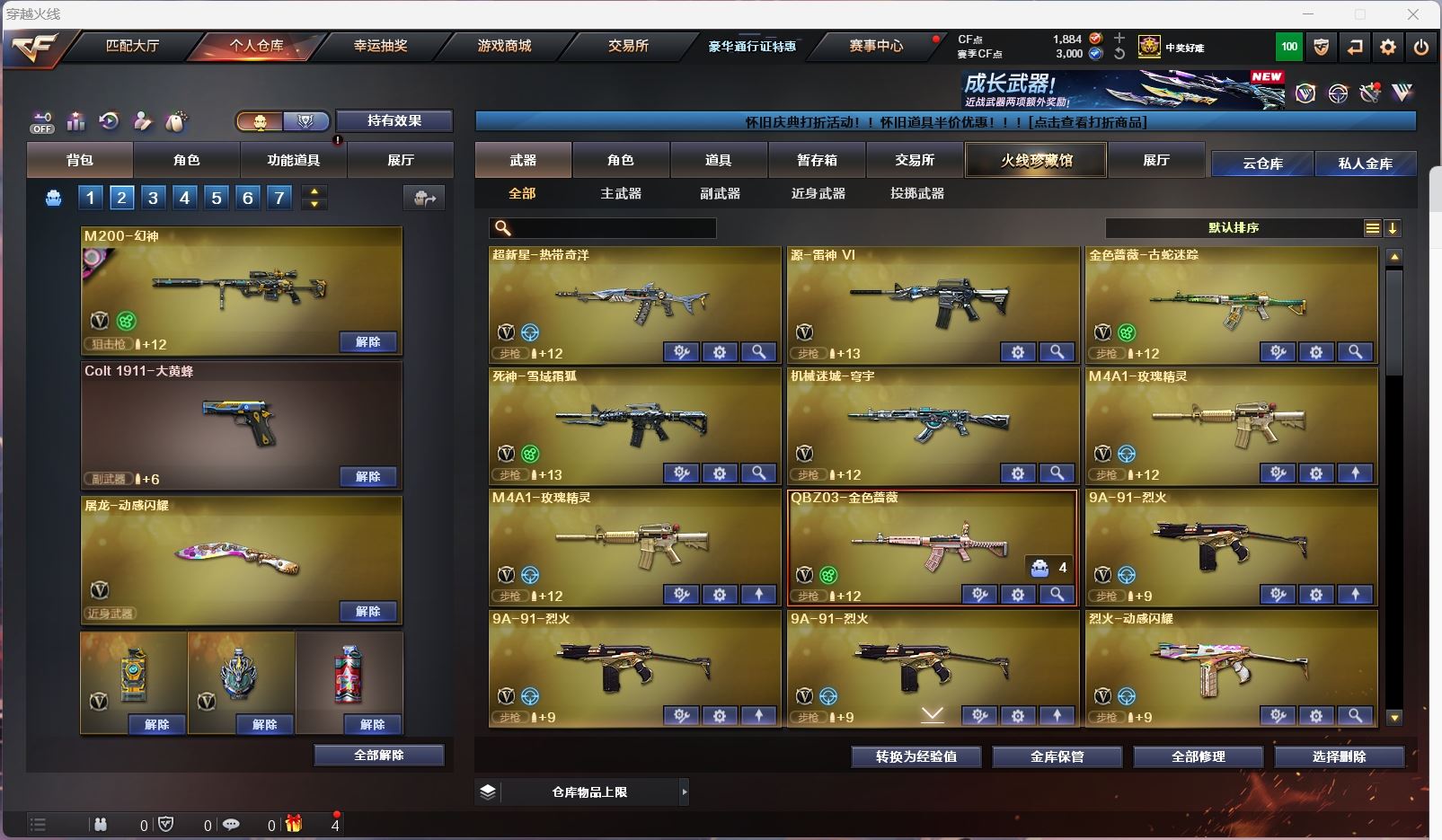 【亮点解析 幻神三件套 裁决三件套 】【m200幻神+音效卡+宠儿】【98k星神】【白虎电玩】【qbz金色蔷薇+卡】【火麒麟+女团+cfs2018】【黑龙】【雷神+女团+荣耀之魄】【黑骑士+卡】【毁灭】【裁决+卡+叶芒苍灵 】【武器:烈火 王者之戮 炼狱*3 烈龙*2】【7手枪:修罗*4 天神*3】【9刀具:屠龙 龙啸 擎天 麒麟刺 竞技荣光 龙啸 】【雷套:云龙雷】【小人枪:朱雀蛇隐宗 雷神精英刀锋】【音效卡:裁决音效卡 黑骑士音效卡 金色蔷薇音效卡 幻神音效卡 】【四防角色:王者炽天使】;QBZ03-金色蔷薇,M200-幻神,Kar98K-星神,