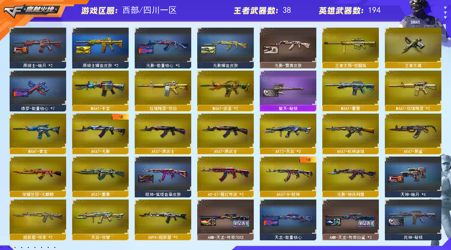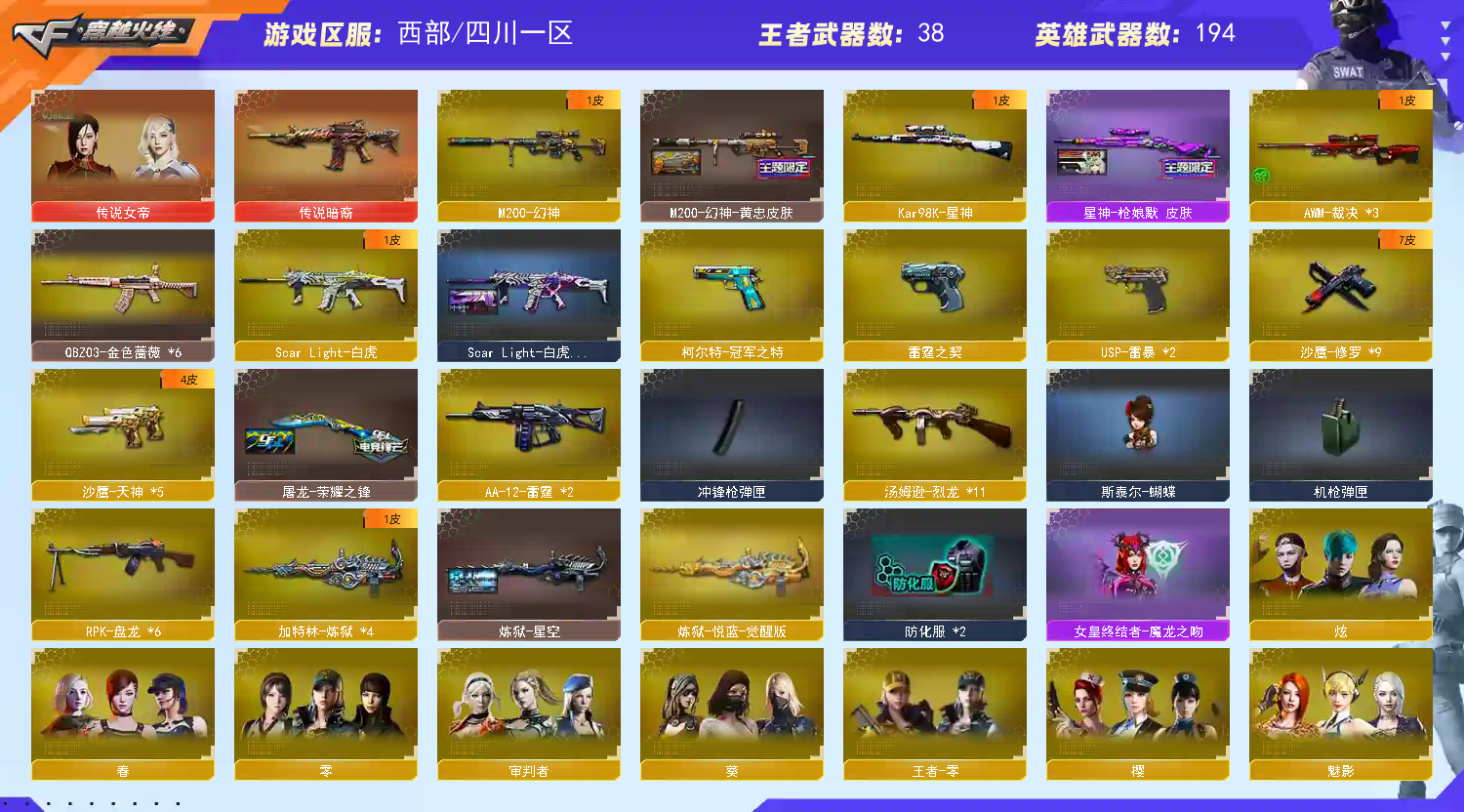 【亮点解析 女帝 生化高配 】【传说女帝】【m200幻神+黄忠+usp雷暴*2+冠军之特】【98k星神+枪娘】【6盘龙 5炼狱 6烈龙 斯太尔蝴蝶 】【传说暗裔】【scar白虎+暗星】【qbz金色蔷薇】【火麒麟+卡+冠军之心 +荣耀世冠】【黑龙】【雷神+卡+白鲨冠军+荣耀之魄】【黑骑士*4】【毁灭+卡+荣耀之怒+cfs2018+ag15冠军+冠军之怒】【极光】【裁决 】【雷暴套 】【武器:天启 黑武士 武圣 雷暴 雷霆 青龙 王者之心 王者之魄 王者之翼 王者之势 王者之幻 荣耀世冠火麒麟 】【18手枪:修罗*9 天神*5 武圣 雷暴*2 雷霆 冠军之特 】【24刀具:屠龙*8 龙啸*4 擎天*4 麒麟刺*5 尼泊尔雷霆 王者之啸 斩神刀雷暴 王者之击 】【11雷套:雷霆雷*4 雷暴雷*7】【音效卡:雷神音效卡 毁灭音效卡 毁灭音效卡 火麒麟音效卡 】【角色:春 葵 零 樱 鹰 炫 魅影 】;USP-雷暴,柯尔特-冠军之特,传说女帝,RPK-盘龙,QBZ03-金色蔷薇,M200-幻神,Scar Light-白虎,