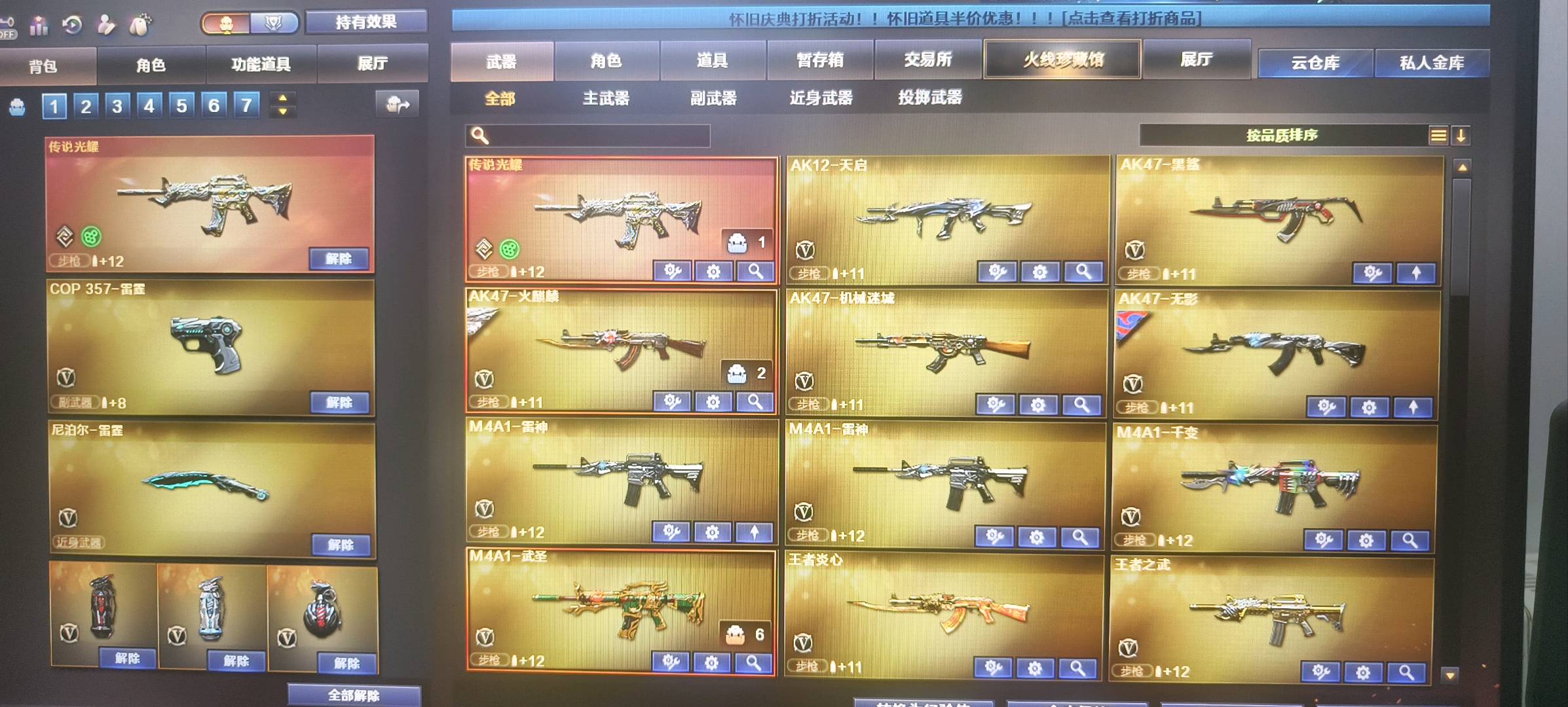 巴雷特极光音效,各种玩偶,传说光耀等等;USP-雷暴,炽芒蝶刃,RPK-盘龙,QBZ03-金色蔷薇,M200-幻神,Scar Light-白虎,