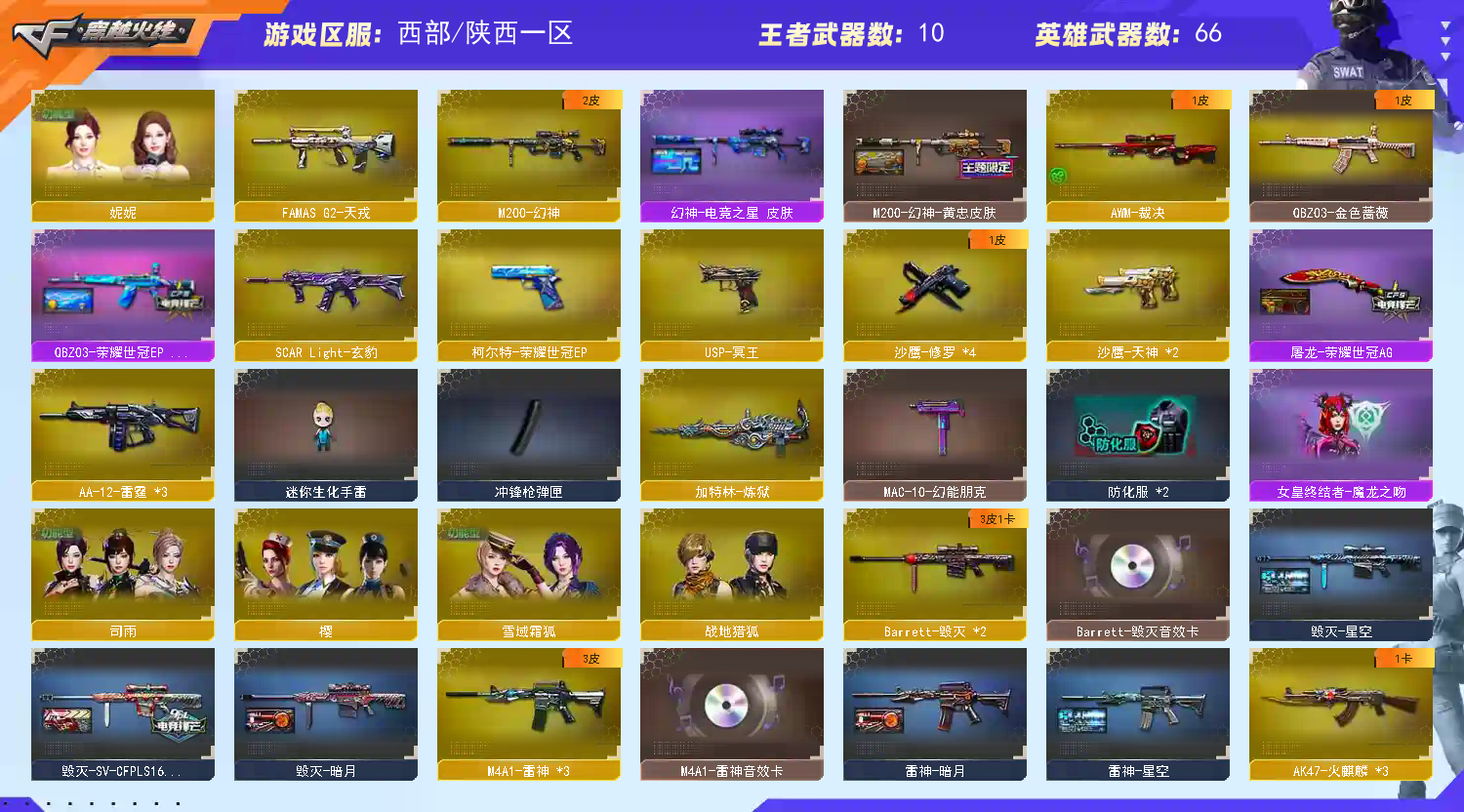 妮妮:幻神电竞之星王者凌虎天戎玄豹白虎蔷薇ep裁决冥王usp柯尔特ep毁灭雷神黑骑3件套;妮妮,QBZ03-金色蔷薇,M200-幻神,