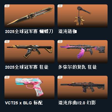 wegame无畏契约★星际猎兵 短剑,混沌链枷,2025全球冠军赛 蝴蝶刀,诛心猎手 冥驹,甜心猎手 戍卫,星际猎兵 判官,诛心猎手 正义,甜心猎手 蜂刺,诛心猎手 奥丁