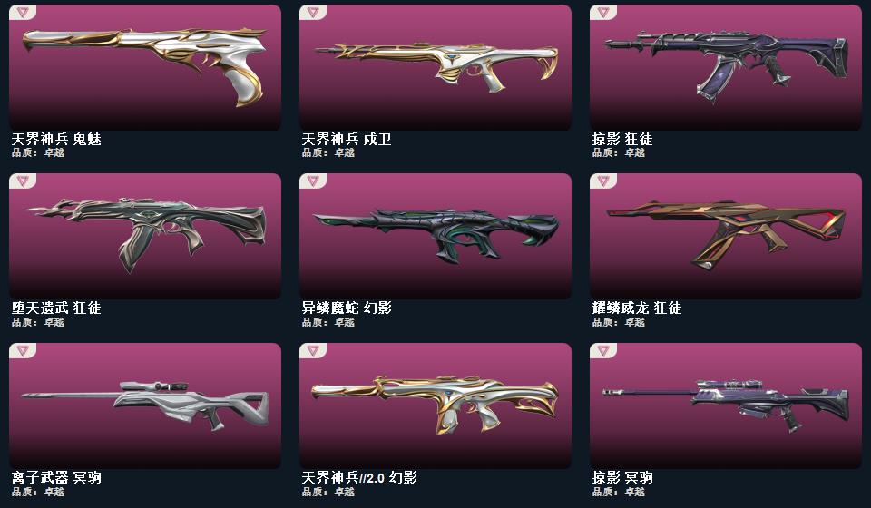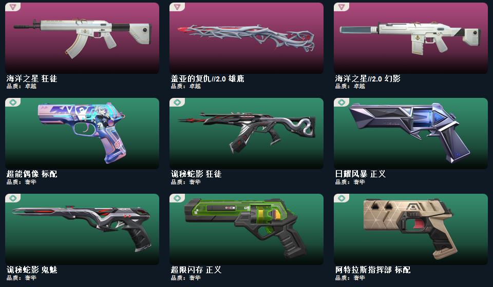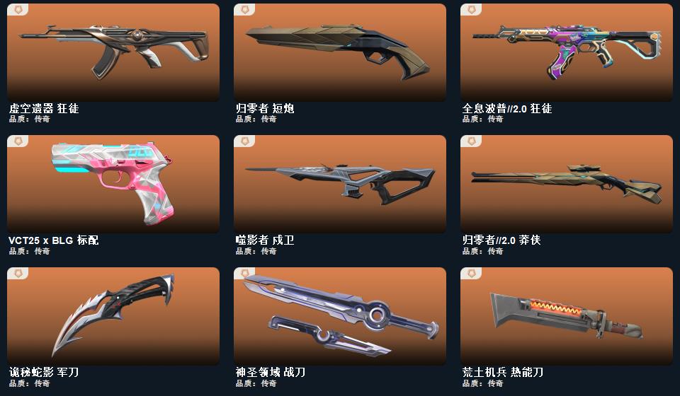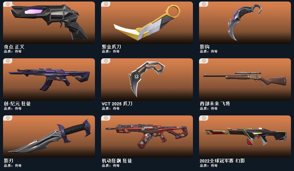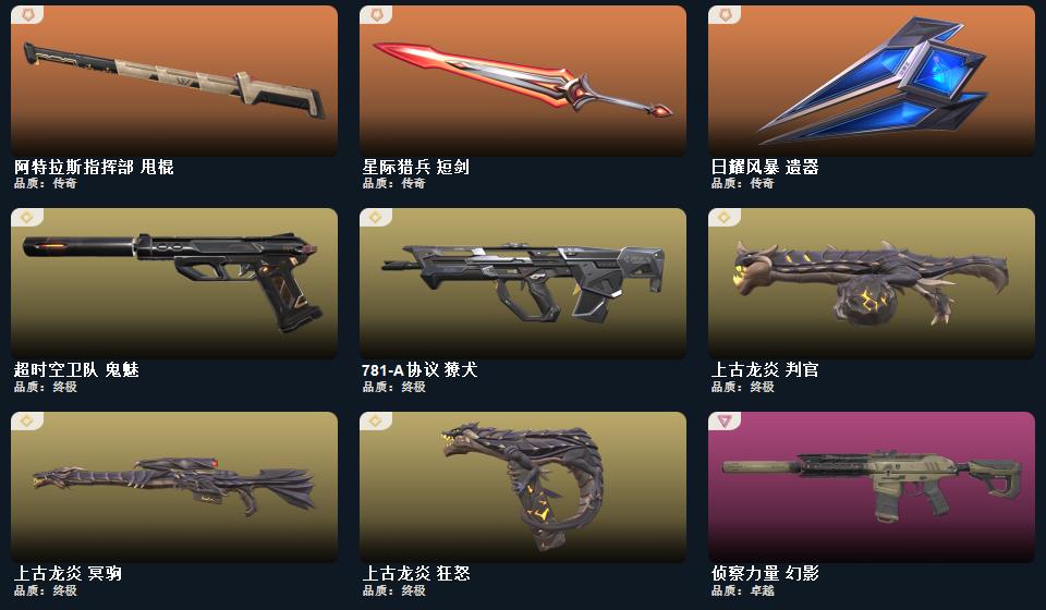 wegame无畏契约★星际猎兵 短剑,影钩,阿特拉斯指挥部 甩棍,紫金爪刀,日耀风暴 遗器,诡秘蛇影 军刀,VCT 2025 爪刀,神圣领域 战刀,影刃,荒土机兵 热能刀,光环序列 冥驹,海洋之星//2.0 幻影,星际猎兵 标配,瑰梦艺语 鬼魅,瑰梦艺语 骇灵