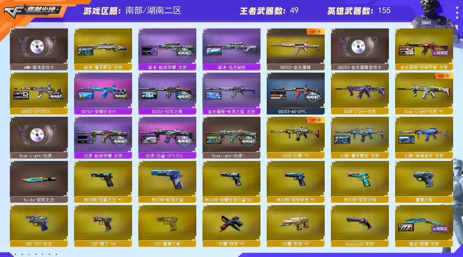 ⭐M200: 3幻神+音效卡+光海夜岚,权,周瑜,KZ,2023白鲨,EP,传奇欧欧,AG,荣耀白鲨,动感闪耀。传说灵眸,传说幽瞳,王者风神,竞技荣光。 ✨如发现仓库不符合描述请看一眼金库保管! ✨时间到请勿开启排位赛!(因近期排位多次退赛导致1-7天禁赛,恳请大家配合!) (若因登号器等问题导致退赛请在维权处说明。或临时有事不想玩了都可随时维权标明❤️) ✨温馨提示:请自行先检查调配背包,装扮,特效,灵敏度,键位,防弹衣,工具钳,防化服。 (新神威活动一万四保底角色,过年活动氪金近五万,兄弟们千万别氪金) ✨11传说: 神威莲华,神威天凌 传说星骇,传说灵眸,传说幽瞳,传说圣谕,传说夜影,传说辉光,传说破晓,传说幽冥*2。 ✨21高质副手: Colt:冠军之特,无冕之王*2,世冠白鲨,电竞之星,滑雪健将。 COP:王者堕天神*3,雷霆,云龙。 USP:冥王*4,王者雷暴,新春舞狮。 Mac龙宝。 ✨13种热门武器音效卡: 幻神,幻影,星神,裁决,毁灭,白虎,雷神,金色蔷薇,天罚,朱雀,炼狱,黑骑士,龙啸。 ✨4防角色: 神威莲华,传说星骇,鹰,隼,隐 云悠悠,岚兮儿,关小雨,司雨,玄豹 王者潘多拉,王者岚兮儿 王者迷迭香,王者炫 三防角色:晴雅,研,智,华 ✨所有王者武器全部觉醒 ✨生化满配: 4防神威莲华,隼,4把赤芒蝶刃(带3高质量皮),6烈,4盘,一堆炼狱,传说破晓,Mac。 斯太尔-蝴蝶+斯太尔-枪娘利刃,异变清道夫+清道夫-蛇影双娇,毒蜂。 炼狱-奇幻国王鬃狮,金翼禅狮,奇幻宇宙万象,3炼狱+音效卡+钟馗+悦蓝。 ✨热门武器音效卡+皮肤: 星神6皮音效卡+ 拼搏,冠军之星,黯钢战甲,傲竹金蛇,璀璨,破竹。 裁决音效卡+ 量子聚变,巅峰荣耀,流光秘银。 白虎音效卡+ 拼搏,白鲨,冠军,巅峰荣耀。 毁灭音效卡+10皮 金色蔷薇音效卡+冠军, EP,AG,CFS2024+枪娘+电竞之星。(柯基,奇妙鲨) 雷神音效卡+13皮。带超核至尊,拼搏,冠军。 天罚音效卡+新皮。 ✨套装:量子之心套,竞技荣光套,玄豹套,云龙套;