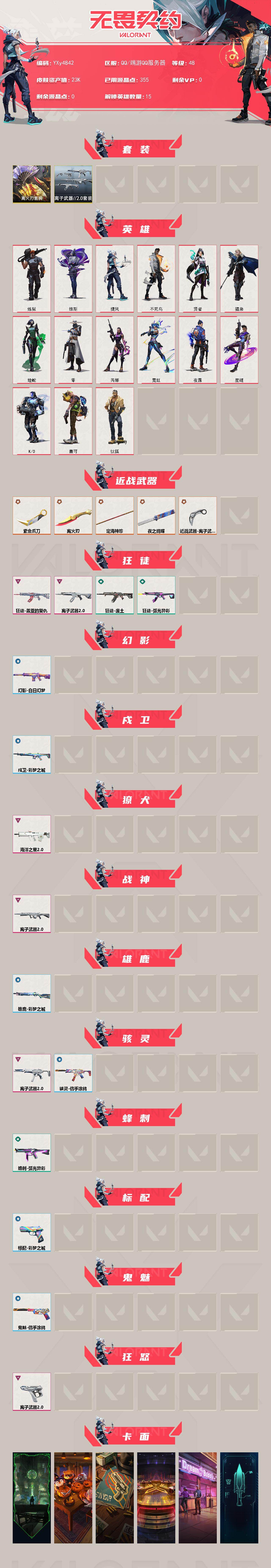【套装】:离火刃套装,离子武器//2.0套装,离火刃套装 【英雄】:炼狱,维斯,钛狐,捷风,不死鸟,贤者,猎枭,蝰蛇,零,芮娜,霓虹,夜露,星礈,K/O,盖可 【近战武器】:近战武器-紫金爪刀,近战武器-离火刃,近战武器-夜之蝴蝶,近战武器-离子武器//2.0 爪刀,近战武器-定海神珍 【狂徒】:狂徒-盖亚的复仇,狂徒-离子武器//2.0,狂徒-废土,狂徒-弧光异彩 【幻影】:幻影-白日幻梦 【戍卫】:戍卫-彩梦之城 【獠犬】:獠犬-海洋之星//2.0 【战神】:战神-离子武器//2.0 【雄鹿】:雄鹿-彩梦之城 【骇灵】:骇灵-离子武器//2.0,骇灵-信手涂鸦 【蜂刺】:蜂刺-弧光异彩 【标配】:标配-彩梦之城 【鬼魅】:鬼魅-信手涂鸦 【狂怒】:狂怒-离子武器//2.0 【卡面】:欢迎来到底城 卡面,南瓜盛典 卡面,正义的化身 卡面,最高舞台 卡面,梦幻奶茶 卡面,零点嗅探设计图 卡面,无畏契约GO!一卷:芮娜 卡面,清除名单 卡面,无畏契约GO!一卷:零 卡面,暗枪 卡面,"Luie" 卡面,铁臂设计图 卡面,代号红色 卡面,冰淇淋店 卡面,新兵报到 卡面,友军火力 卡面,V契约 卡面,无畏契约 卡面 【喷漆】:都算到了 喷漆,超级粉丝 喷漆,捷风差距 喷漆,我的刀呢? 喷漆,新潮流 喷漆,买装还是存钱 喷漆,胜利属于无畏契约 喷漆,GLHF 喷漆,无畏契约 喷漆 【挂饰】:第九季//第三幕 纪念币 挂饰,无畏契约GO!第卷 芮娜 挂饰,无畏契约GO!一卷 零 挂饰,第九季//第二幕 纪念币 挂饰,袖珍捷风 挂饰,第九季//一幕 纪念币 挂饰,第八季//第三幕 纪念币 挂饰,天外飞客 挂饰,好运福爪 挂饰,第七季//第三幕 纪念币 挂饰,幸运中国结 挂饰,第七季//第二幕 纪念币 挂饰,无畏契约 纪念币 挂饰;离火刃,紫金爪刀,盖亚的复仇 狂徒,离子武器//2.0 狂徒,