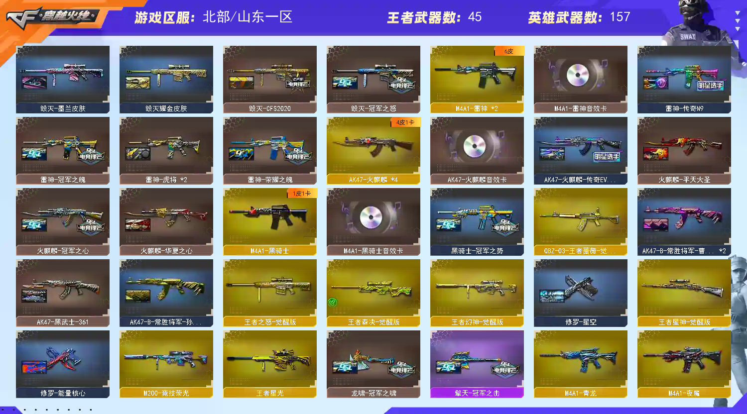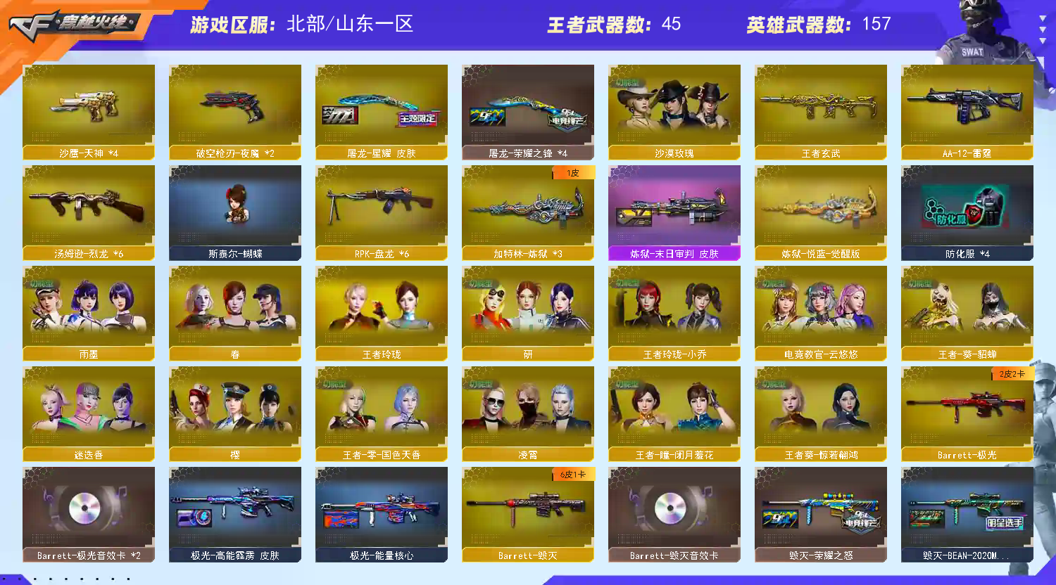 编号:SD372北部山东一区✅全能号✅四防传说星骇+4传说+幻神5件套✅6盘炼狱6烈蝴蝶+裁决3件套✅荣耀世冠柯尔特✅银翼幻影+柯尔特冠军之特 稀有武器:传说光耀、传说夜影、传说圣谕、传说幽瞳、M200幻神、98K星神、盘龙X6、炼狱X4、烈龙X6、M200竞技荣光、火麒麟X4、雷神X2、黑骑士、无影、黑武士X2、天启、超新星、雷暴X2、M4A1青龙、HK417朱雀、Scar白虎、Barrett朱雀、M4A1夜魔、G36C幻影、QBZ银翼、机械迷城穹宇、QBZ金色蔷薇、烈火、毁灭、极光、裁决X3、Barrett电竞装甲、雷霆、修罗X4、天神X4、COP雷霆、USP雷暴X2、COP堕天神、破空枪刃夜魔X2、柯尔特电竞装甲、柯尔特竞技荣光、荣耀世冠柯尔特、COP雷霆王者X3、柯尔特冠军之特、屠龙X7、擎天、麒麟刺、斩神刀雷暴、马来剑夜魔、尼泊尔电竞装甲X3、M4A1雷霆王者 稀有角色:传说星骇(四防副武器自动装弹/免伤/减伤/减闪)、沙漠玫瑰(四防佣兵觉醒/生存本能/生化觉醒/狩猎本能)、四防电竞教官云悠悠、春、凌霄、迷迭香、研、樱、雨墨、王者葵貂蝉、王者零国色天香、王者瞳闭月羞花、王者葵惊若翩鸿、王者玲珑、王者玲珑小乔、新海豹突击队、炽天使、灵狐者黄金海岸 音效卡:M200幻神音效卡、98K星神音效卡、雷神音效卡、毁灭音效卡、火麒麟音效卡、极光音效卡、裁决音效卡、极光音效卡、黑骑士音效卡、QBZ金色蔷薇音效卡、白虎音效卡 稀有皮肤:幻神Hearshot皮肤/宠儿2021MVP皮肤/冠军之幻皮肤、金色蔷薇量子蔷薇皮肤/冠军之薇皮肤、超新星兔兔战士皮肤、屠龙星耀皮肤/荣耀之锋皮肤X4、炼狱末日审判皮肤、白虎白鲨CFPLS23冠军皮肤/电玩粉兔皮肤、火麒麟AG战队皮肤/华夏之心皮肤/平天大圣/CFSTAR皮肤X2/冠军之心皮肤/传奇EVEN皮肤/拼搏皮肤、裁决流光秘银皮肤X2、星神巅峰荣耀皮肤/璀璨皮肤/冠军之星皮肤、黑骑士冠军之势皮肤、毁灭耀金皮肤/SVCFPLS16冠军皮肤/荣耀之怒皮肤/BEAN2020MVP皮肤/CFS2020皮肤/墨兰皮肤/冠军之怒皮肤、雷神虎将皮肤X2/传奇N9皮肤/冠军之魄皮肤X2、 王者武器:王者炎心、王者之城、王者之心、王者之影、QBZ蔷薇王者、王者玄武、王者冰魄、王者之戮、王者之魄、王者之烈、王者幻神、王者森决、王者森力、王者星光、王者之怒、王者星神、雷霆王者之锋、王者冰锋X3、王者之锋、王者之击、王者之啸X2、炫金天龙 小人枪及特殊武器:斯泰尔蝴蝶、AWM灵狐15周年嘉年华、金砖X2、魔能飞环曼陀罗、苍雷 投掷武器及套装:雷暴套X7、夜魔套X7、电竞装甲X7、雷霆王者套X3;USP-雷暴,荣耀世冠-柯尔特,柯尔特-冠军之特,沙漠玫瑰,传说星骇,电竞教官-云悠悠,RPK-盘龙,