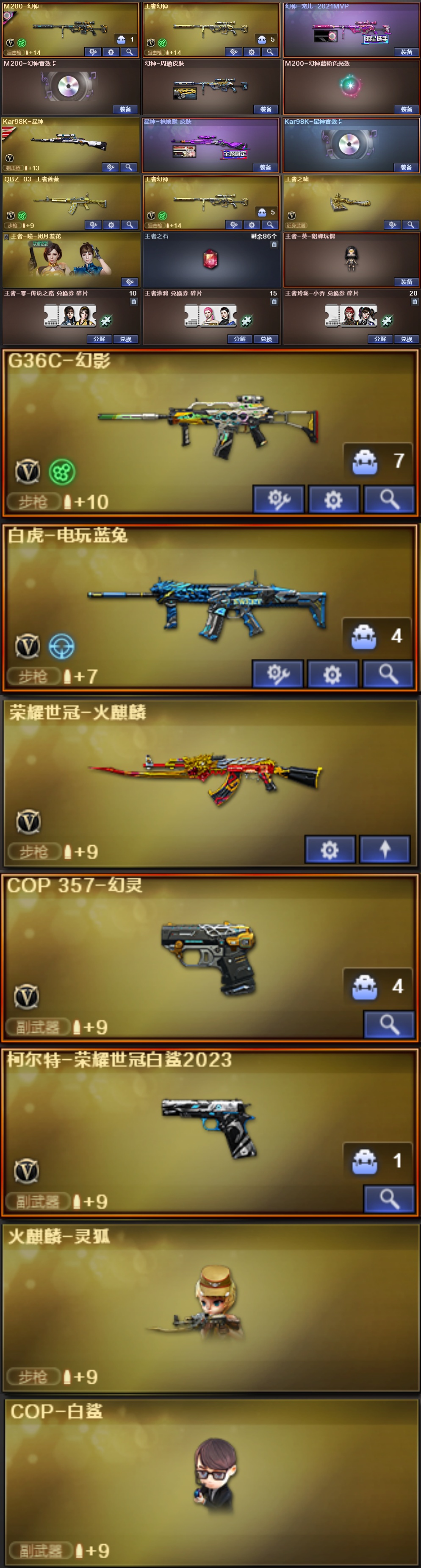 【北部幻神 星神三件套】【m200幻神+宠儿皮肤+周瑜皮肤+幻神音效卡】【98k星神+枪娘默皮肤+星神音效卡】【觉醒王者幻神】【觉醒王者蔷薇】【觉醒王者之啸】【G36c幻影】【白虎电玩蓝兔】【荣耀世冠火麒麟】【AWM裁决】【cop幻灵】【柯尔特荣耀世冠白鲨2023】【千变x2/火麒麟x5/雷神/黑骑士/天启x2/机械迷城/黑鲨/青龙/HK朱雀/无影神兵利器/m4玫瑰精灵/猩红传说x9/AK战士/AK战神/毁灭x3/极光】【修罗x3/cop幻灵x3/cop云龙/柯尔特荣耀世冠白鲨】【屠龙x3/擎天/幻灵之锋/觉醒王者之啸/龙啸烈火龙威】【幻灵手雷包/竞技荣光手雷包/云龙手雷包/玄豹手雷包】【火麒麟灵狐/cop白鲨】【电竞教官云悠悠/王者瞳闭月羞花/修道士】【齐天大圣/铁骑荣耀/樱战斗天使/潘多拉甜心教官/潘多拉锋芒精英/灵狐者七夕宝贝/龙儿小淘气/兰-空鹰/空】【潘多拉-x/圣诞潘多拉-x/飞虎队-x/救世主-x】【永久烟雾头宇航月】【BS战队炫彩背包/ep战队炫彩背包/炫彩背包/超级背包】【幻神音效卡】【星神音效卡】【雷神音效卡】【毁灭音效卡】【黑骑士音效卡】【火麒麟音效卡】【幻神宠儿皮肤/幻神周瑜皮肤】【星神枪娘默皮肤】【雷神机甲刑天皮肤/雷神宇航兔皮肤/雷神白鲨cfpls14皮肤】【屠龙荣耀世冠AG皮肤x2】【火麒麟AG战队皮肤】【AC/手雷包/c4钳永久】;柯尔特-荣耀世冠白鲨2023,电竞教官-云悠悠,G36C-幻影,M200-幻神,Kar98K-星神,