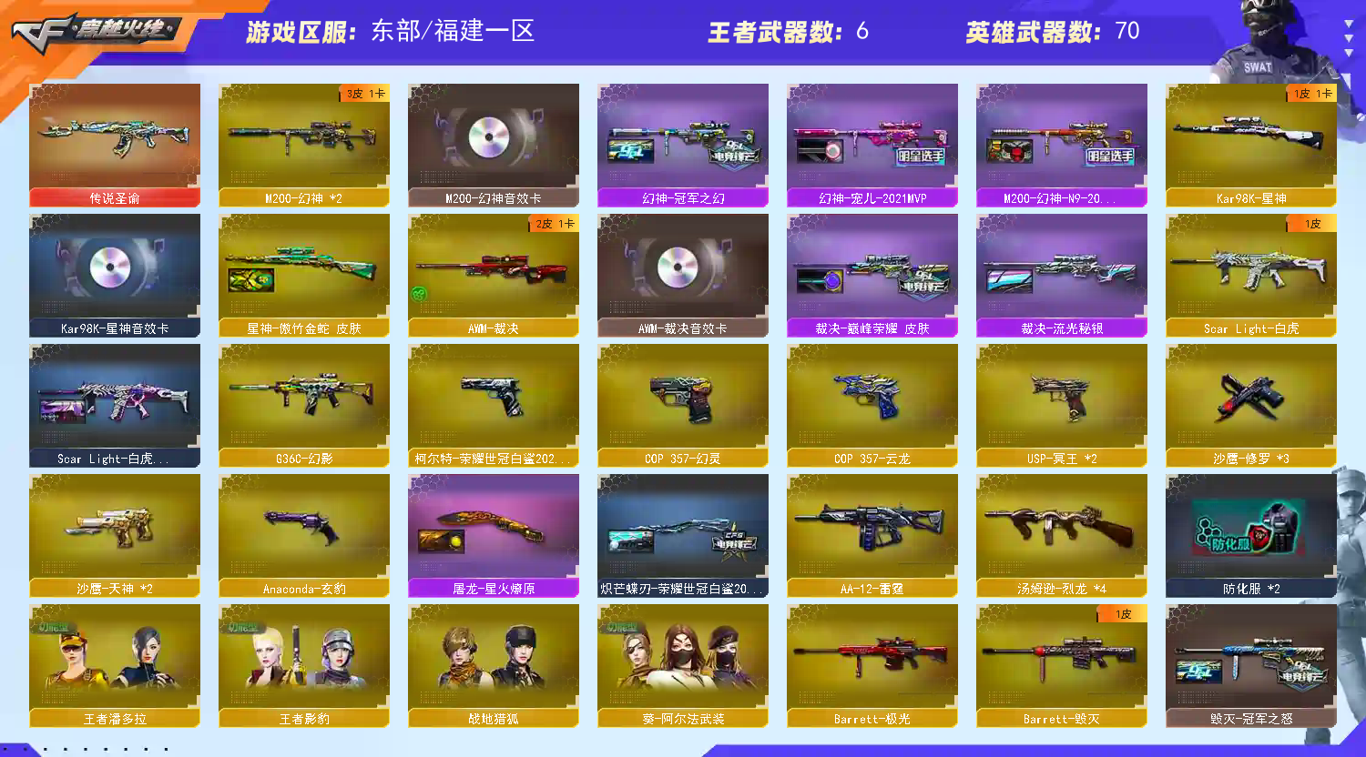 【传说圣瑜】【幻神*2+3件套+3皮肤/冠军之幻+N9-2022MVP+宠儿-2021MVP】【星神3件套+傲竹金蛇皮肤】【裁决3件套+2皮肤/流光秘银皮肤+巅峰荣耀皮肤】【白虎+暗星皮肤】【G36C-幻影】【QBZ-03-王者蔷薇】【AK47-火麒麟+2皮肤百城皮肤+大唐荣光皮肤】【雷神+3皮肤/宇航兔皮肤+R.LGD-CFPLS18冠军皮肤+CFS 2019皮肤】【黑骑士-破浪10年皮肤】 【毁灭+冠军之怒皮肤】【屠龙+星火燎原皮肤】【龙啸+3皮肤/纸灯龙皮肤+黯钢战甲皮肤+再燃火线皮肤】【炽芒蝶刃+荣耀世冠白鲨2023皮肤】【AN94-超新星】【AK47-黑鲨】【M4A1-龙血】【黑武士-锦绣游龙】【超新星-热带奇洋】【机械迷城-穹宇】【M4A1-玫瑰精灵】【觉醒王者芳薇】【巴雷特-极光】【觉醒王者之怒】【烈龙*4】【AA-12-雷霆】【沙鹰-天神*2】【COP357-幻灵】【USP-冥王*2】【COP357-云龙】【柯尔特-荣耀世冠白鲨2023】【Anaconda-玄豹】【斩神刀-雷霆】【幻灵之锋*2】【龙啸-热带奇洋】【龙啸-云海游龙】【丛林匕首-玄豹】【龙啸-烈火龙威】【觉醒王者冰峰幻灵手雷包*4】【雷暴手雷包】【云龙手雷包】【零-纪元】【战力猎狐】【葵-阿尔法武装】【奇洋探员】【王者潘多拉】【王者影豹】【电竞少女/嘉年华灵狐/潘多拉-锋芒精英/青霞仙子/蛇姬/兔团团】【暗夜-x/飞虎队-x/剑齿虎-x/救世主-x/灵狐者-x/曼陀罗-x/潘多拉-x/深海之兰-x/圣诞潘多拉-x】【热带奇洋炫彩背包/亚洲杯纪念炫彩背包/炫彩背包】【可排位/可更改二次实名】【AC/手雷包/c4钳永久】;柯尔特-荣耀世冠白鲨2023,炽芒蝶刃,G36C-幻影,M200-幻神,Scar Light-白虎,Kar98K-星神,传说圣谕,