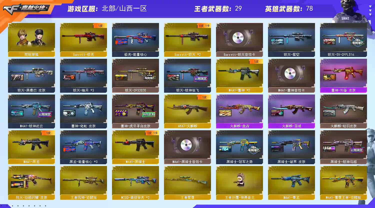 【亮点解析 幻神三件套 Kar98K-星神三件套】【传说幽瞳+传说幽冥】【M200-幻神+音效卡+曹操+幻神-荣耀世冠白鲨2023+幻神-荣耀世冠白鲨+幻神-黄忠】【竞技荣光套+四防云悠悠】【Kar98K-星神+音效卡+巅峰荣耀】【王者风神】【王者星霆】【QBZ03-金色蔷薇+音效卡+量子蔷薇+纸灯龙+破浪逐光】【裁决+裁决-流光秘银】【Barrett-毁灭+音效卡】【极光】【AK47-火麒麟】【黑龙】【M4A1-雷神+音效卡+heartshot】【黑骑士+音效卡+黑骑士-冠军之势+黑骑士-马超】【王者之势】【天启 超新星 青龙 烈火】【10手枪 天神*5 柯尔特荣耀世冠白鲨2023】【16近战 屠龙*7 麒麟刺 炽芒蝶刃蝴蝶刀】【手雷 竞技荣光*8 雷霆王者*5】【四防 雨棠】【幻神音效卡 Kar98K-星神音效卡 QBZ03-金色蔷薇音效卡】;柯尔特-荣耀世冠白鲨2023,传说幽冥,炽芒蝶刃,隼,电竞教官-云悠悠,QBZ03-金色蔷薇,传说幽瞳,