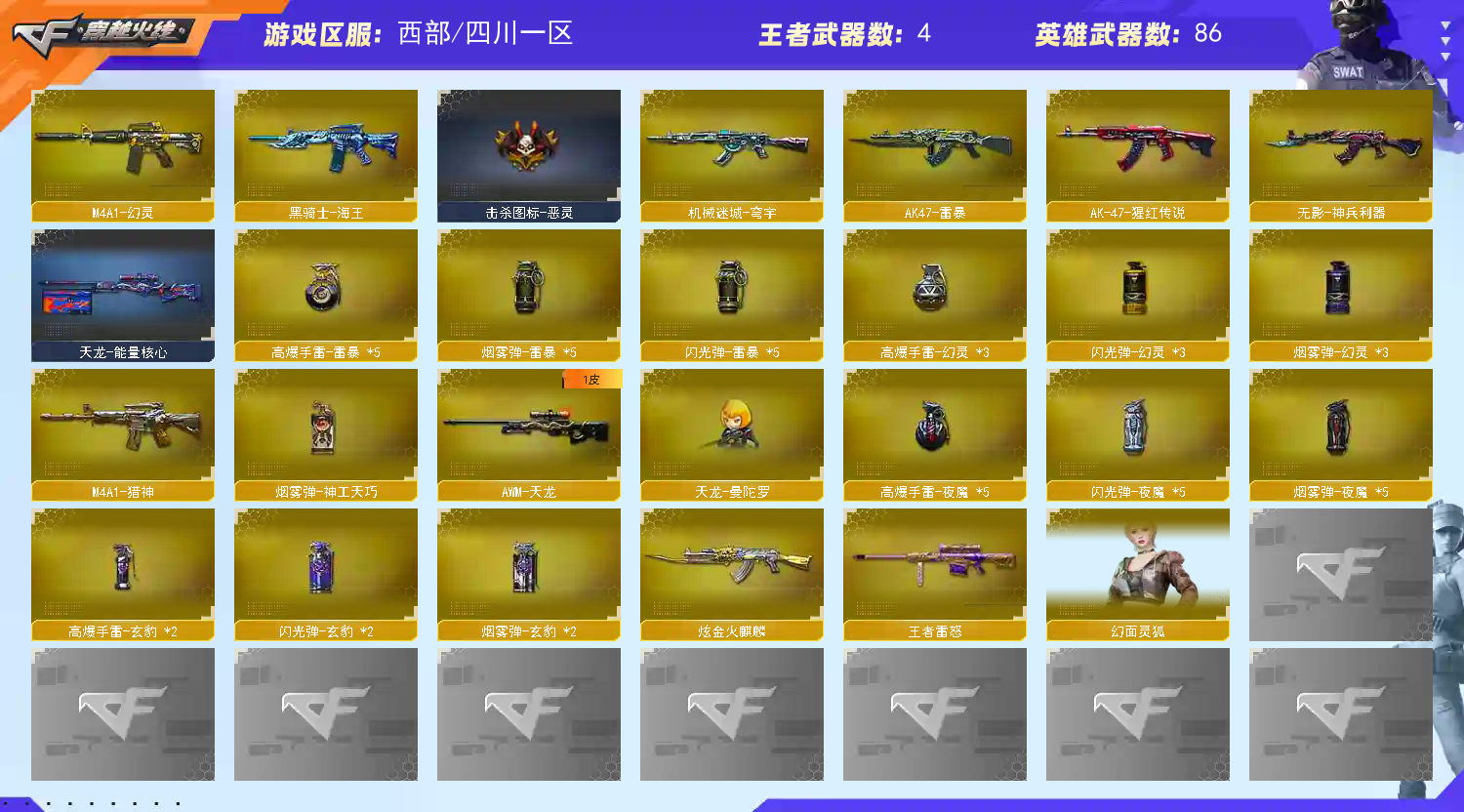 【m200幻神+电竞之星 +周瑜+幻兽雷+usp雷暴】【qbz金色蔷薇】【scar玄豹】【天戎】【雷暴套 夜魔套 幻灵套】【武器:火麒麟 黑骑士 雷暴 夜魔 幻灵 朱雀 海王 天龙 极光 王者雷怒 炼狱 烈龙 】【7手枪:修罗 雷暴 堕天神*2 夜魔 幻灵 沙鹰幻兽 】【9刀具:屠龙 擎天 麒麟刺 斩神刀雷暴 夜魔 幻灵之峰 女皇利刃幻兽 王者之啸】【14雷套:幻兽雷 雷暴雷*5 夜魔雷*5 幻灵雷*3】【小人枪:雷神小红 天龙曼陀罗 斯太尔蝴蝶 】【四防角色:王者涂鸦 】;USP-雷暴,QBZ03-金色蔷薇,M200-幻神,
