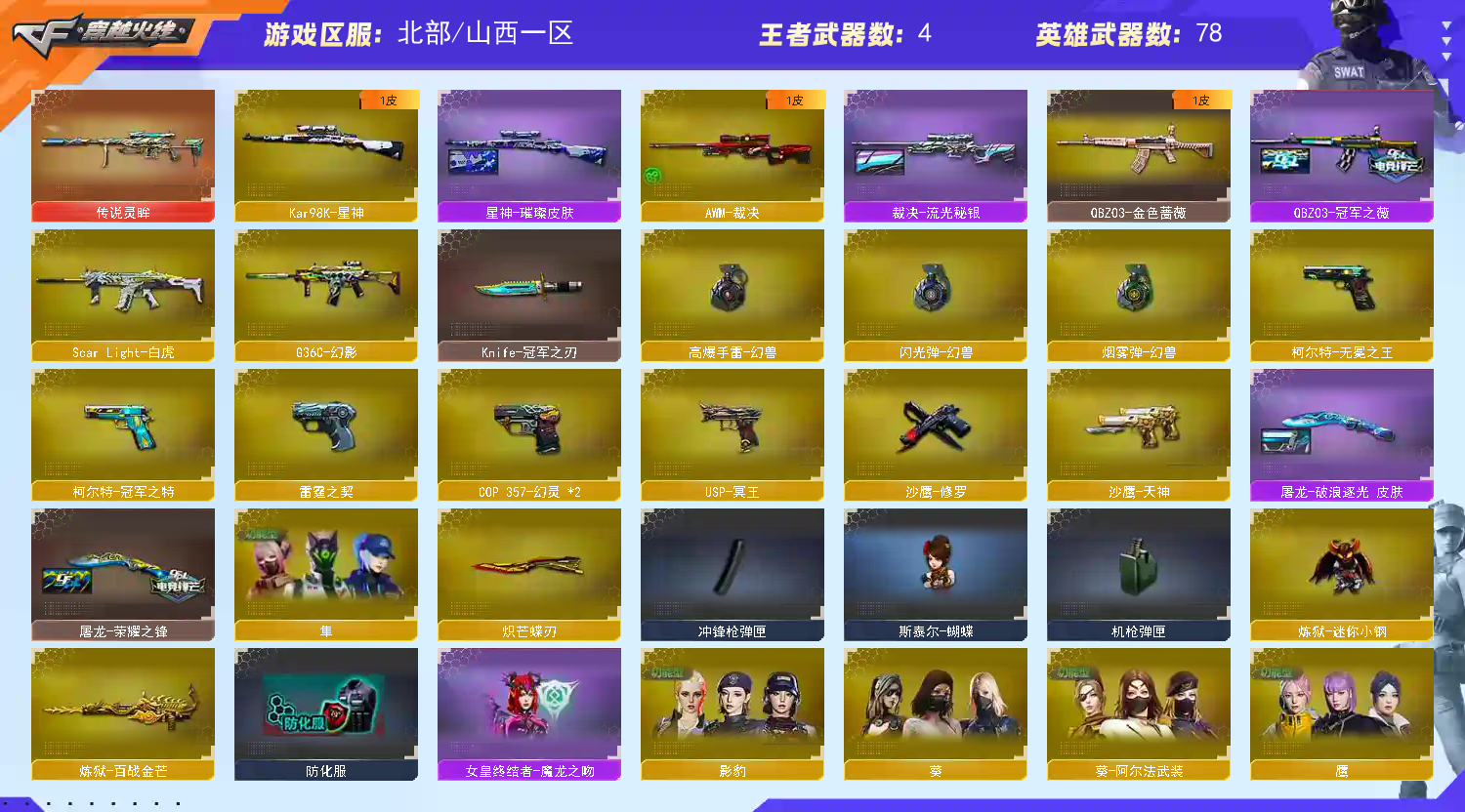 首页 > 租号大厅 > 穿越火线 > 网通区/山西一区 > 四防鹰|隼|传说灵眸|幻兽|星神|白虎|幻影|COP*3|COLT*4|冠军/独角之刃|蝴蝶刀