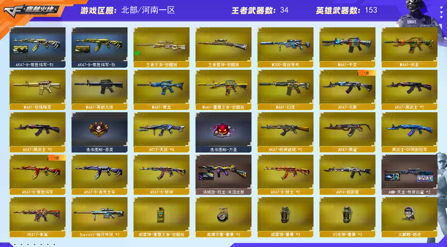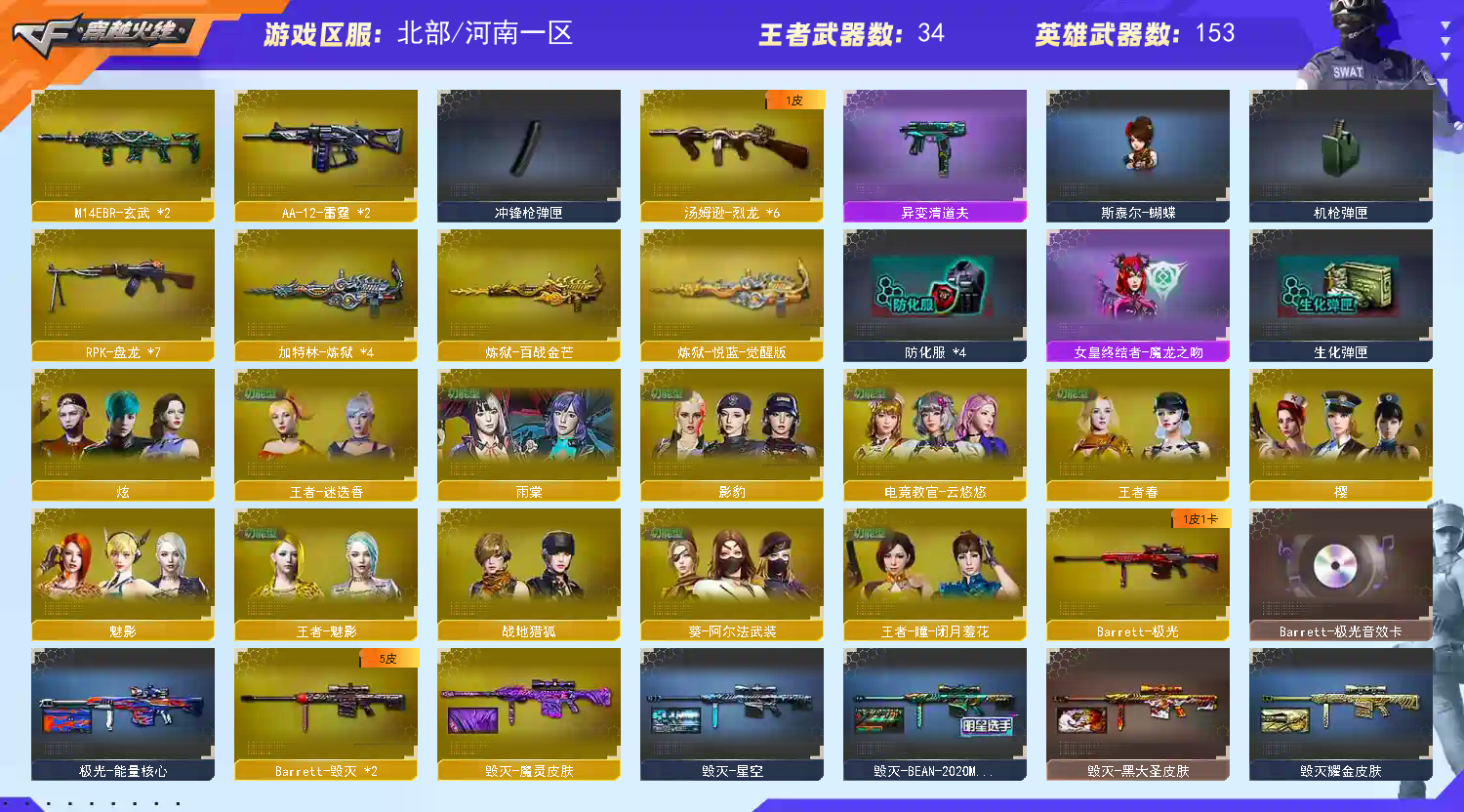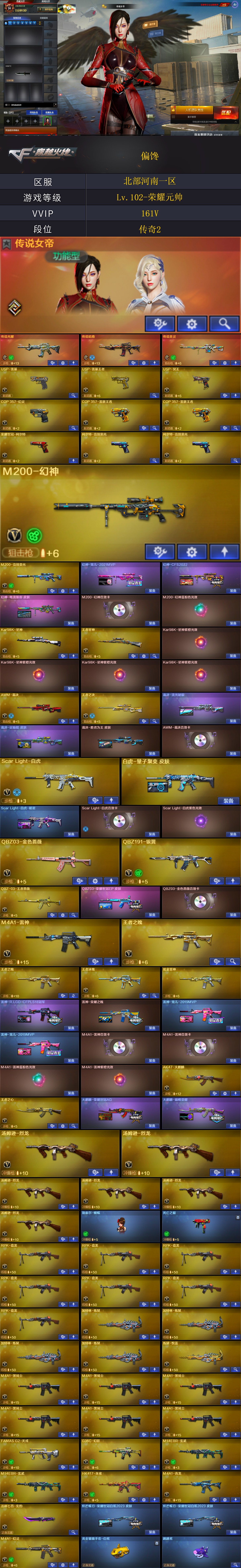 【商品标题】:北部河南一区-161V-可二次实名-【Lv.102-荣耀元帅】-【段位:传奇2】 【稀有武器】:传说光耀/传说暗裔/传说圣灵/M200-幻神/Kar98K-星神/G36C-幻影/ScarLight-白虎/M14EBR-玄武(2)/M4A1-青龙/HK417-朱雀/M4A1-幻灵/USP-雷暴/COP357-幻灵/柯尔特-竞技荣光(2)/荣耀世冠-柯尔特/COP357-雷霆王者-觉醒版(2)/QBZ03-金色蔷薇/AK47-火麒麟(3)/M4A1-黑龙/M4A1-雷神(3)/M4A1-黑骑士(6)/AK47-无影/AK47-黑武士(2)/Barrett-毁灭(2)/Barrett-极光/AWM-裁决(3)/M200-竞技荣光/RPK-盘龙(7)/加特林-炼狱(4)/汤姆逊-烈龙(6)/AA-12-雷霆(2)/斩神刀-雷暴/幻灵之锋/擎天-竞技荣光 【王者武器】:王者之心-觉醒版/王者之魄-觉醒版/M4A1-雷霆王者-觉醒版/QBZ-03-王者蔷薇-觉醒版/王者之决-觉醒版/王者星神-觉醒版/王者之心/王者之魄/王者雷怒 【热门角色】:传说女帝/电竞教官-云悠悠/影豹/雨棠/炫/魅影/王者春/王者-迷迭香/王者-魅影/空/灵狐者-职业经理/潘多拉-X/兔囡囡/幽/职业选手/潘多拉 【热门音效卡】:M200-幻神音效卡/AWM-裁决音效卡/Scar Light-白虎音效卡/QBZ03-金色蔷薇音效卡/QBZ03-天罚音效卡/M4A1-雷神音效卡(2)/M4A1-黑骑士音效卡/M4A1-黑龙音效卡/Barrett-极光音效卡 【热门皮肤】:幻神-宠儿-2021MVP/幻神-CFS2022/幻神-电流骇客皮肤/火麒麟-荣耀世冠AG/雷神-R.LGD-CFPLS18冠军/屠龙-荣耀世冠AG/火麒麟-巅峰荣耀/裁决-流光秘银/黑龙-冠军之武/毁灭-BEAN-2020MVP/雷神-宠儿-2019MVP(2)/ScarLight-白虎-暗星/炽芒蝶刃-荣耀世冠白鲨2023皮肤(2)/黑骑士-AG-S4冠军典藏/屠龙-荣耀之锋/屠龙-春桃皮肤(2)/雷神-荣耀之魄 【其他亮点】:斯泰尔-蝴蝶/异变清道夫/VEPR-12-金魔/宙斯权杖/贝雷塔687-射手座/黄金猫猫手套-白鲨/金刚伞-电玩红兔/烟雾弹-荣耀世冠白鲨2023 (截图展示段位不代表实际段位,如赛季更新等不可抗拒因素发生变化,其余道具看截图或咨询客服);USP-雷暴,USP-雷暴王者,荣耀世冠-柯尔特,传说女帝,电竞教官-云悠悠,RPK-盘龙,QBZ03-金色蔷薇,