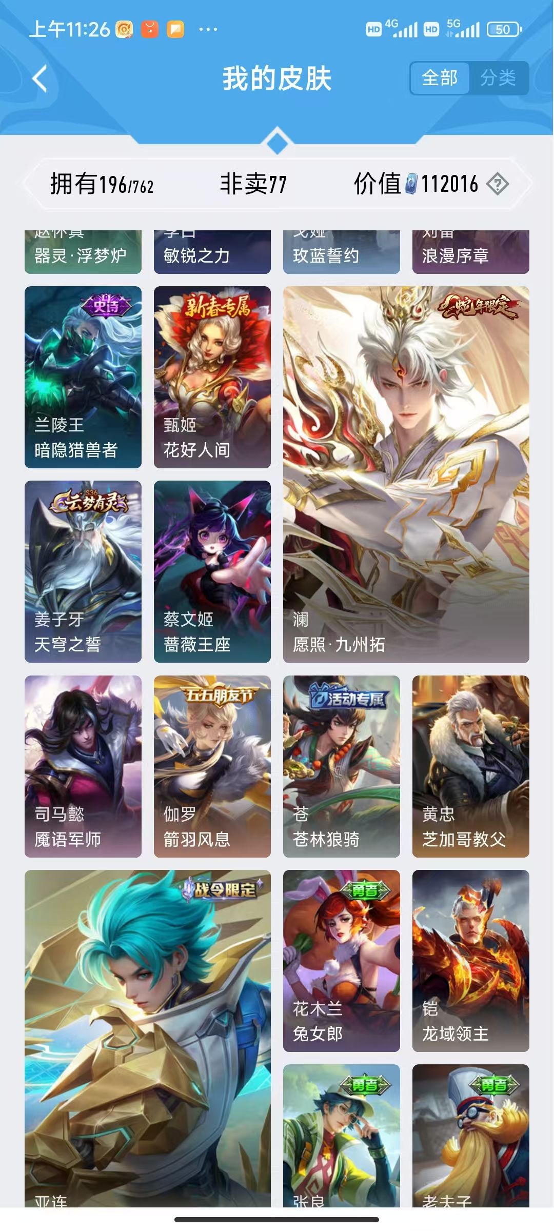 v10、12水555皮、死亡执政官、刘备星传说时之思念、小兵皮肤大耳狗甜茶、瑶无双真我赫兹、愿照·九州拓、怪盗基德、画中仙、至尊宝、凤求凰、神威、天魔缭乱