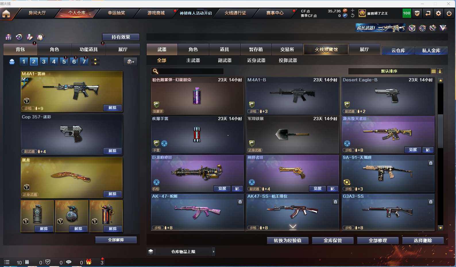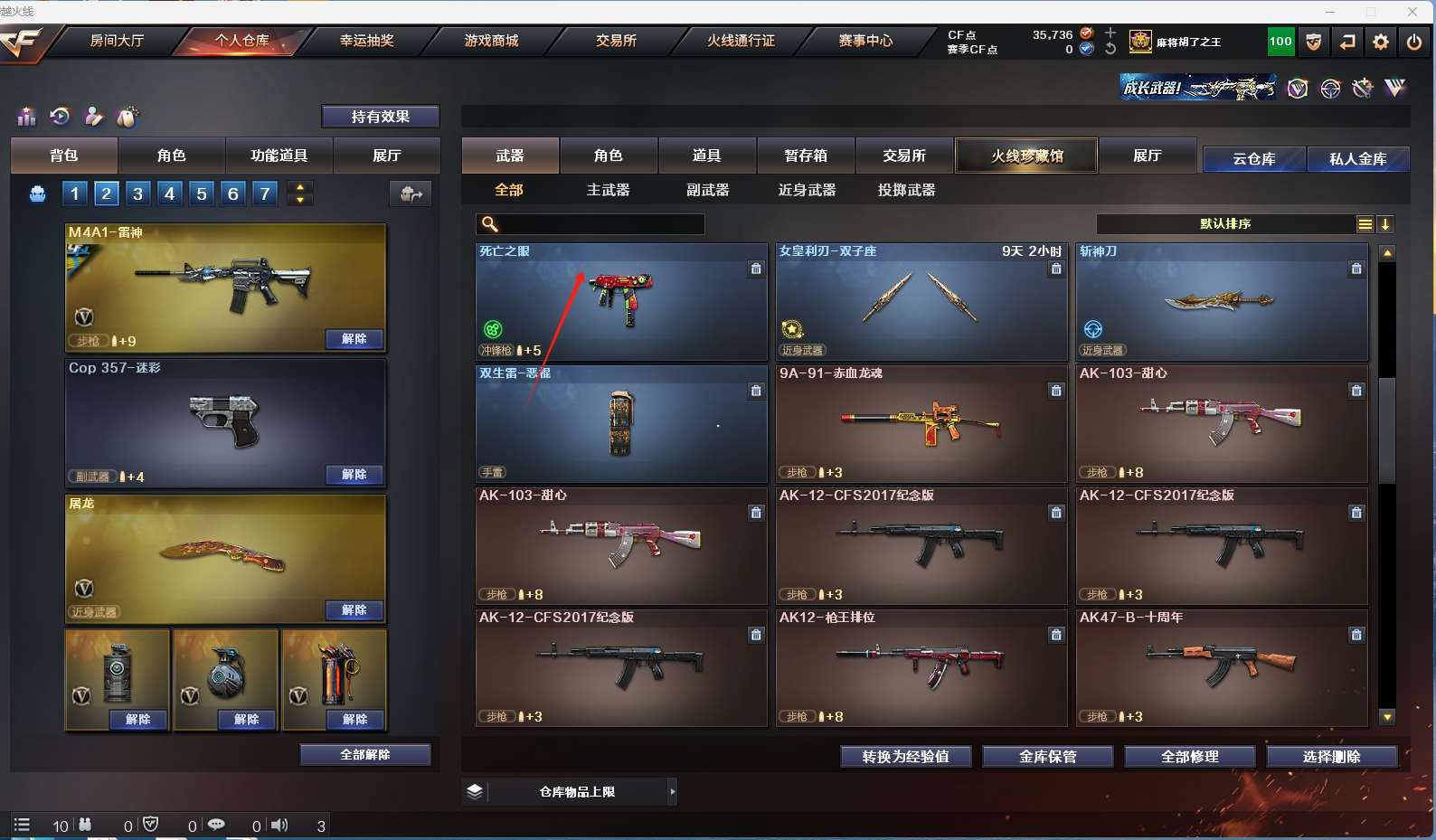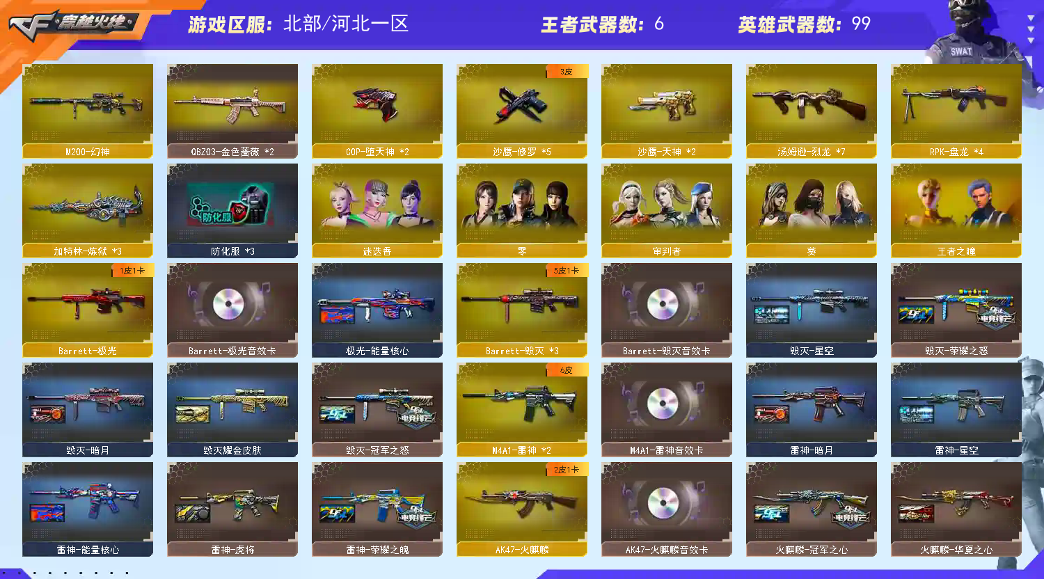 【m200-幻神】 【qbz金色蔷薇】 【堕天神套】 【火麒麟+音效卡+火麒麟-冠军之心】 【黑龙】 【雷神+音效卡+白鲨14冠军+雷神-荣耀之魄】 【黑骑士+音效卡】 【毁灭+音效卡+毁灭-冠军之怒+毁灭-荣耀之怒】 【极光+音效卡】 【王者之魄 王者之怒】 【无影 死神 天启 超新星 黑鲨 hk417-朱雀】 【生化 4盘龙 3炼狱 6烈龙 死亡之眼】 【9手呛 修罗*5 天神*2 cop堕天神*2】 【16近战 屠龙*5 龙啸*2 擎天 麒麟刺*3 斩神刀雷暴 王者之击】 【手雷 雷霆雷 雷暴雷*3 堕天神*6】 【角色 葵 零 迷迭香 审判者 王者之瞳】 【火麒麟音效卡 雷神音效卡 黑骑士音效卡 极光音效卡 毁灭音效卡】 【炫彩背包】;RPK-盘龙,QBZ03-金色蔷薇,M200-幻神,