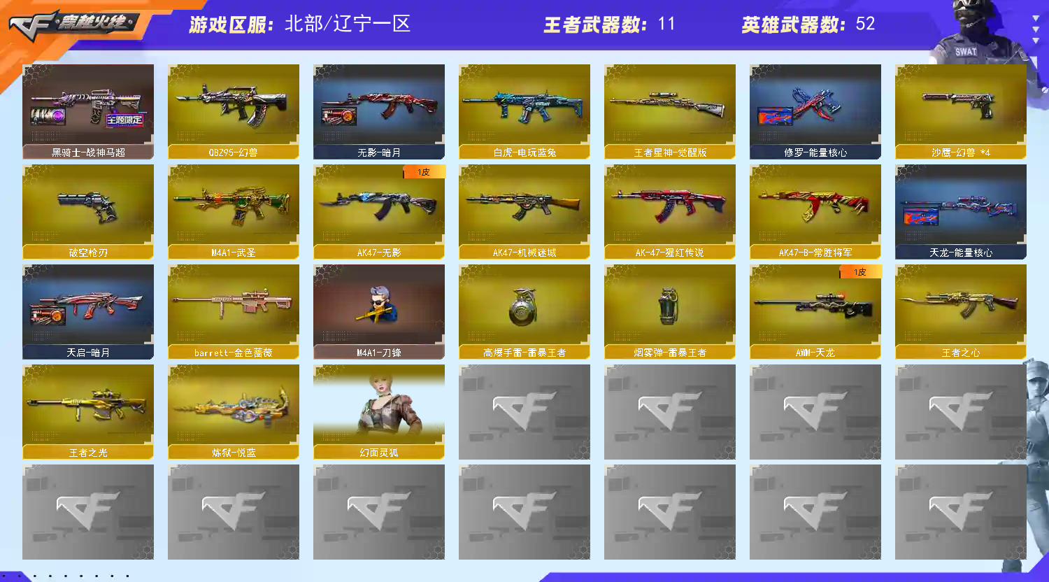 本人偶尔上wegame,如果被顶掉wegame请不要维权哦,继续游戏即可;USP-雷暴王者,QBZ03-金色蔷薇,M200-幻神,Scar Light-白虎,