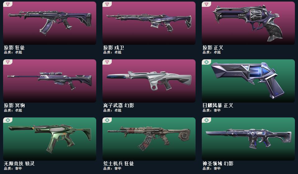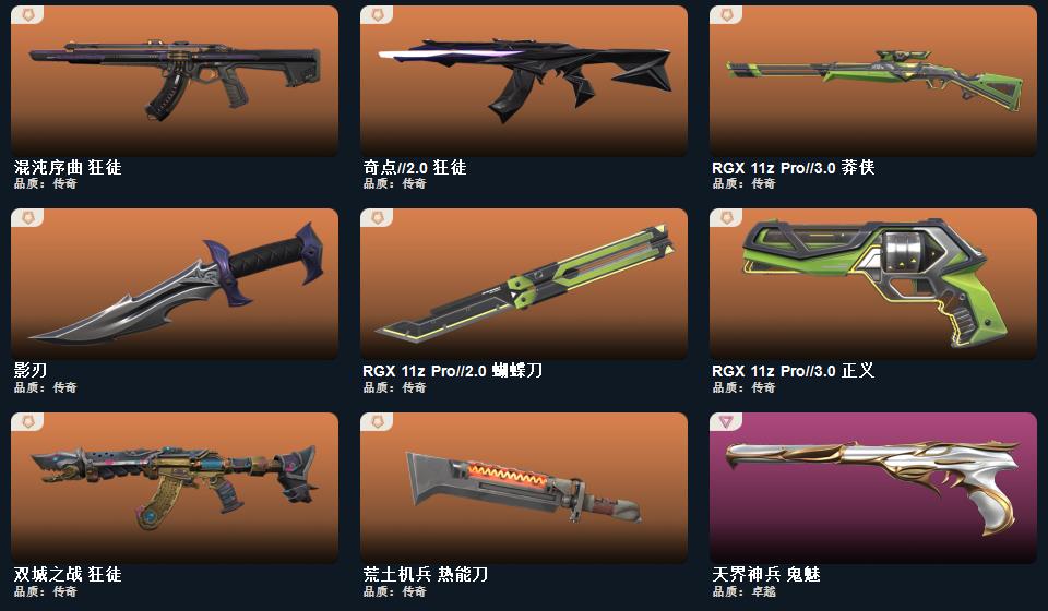 wegame无畏契约★武器皮肤数量:39,RGX 11z Pro//2.0 蝴蝶刀,荒土机兵 热能刀,影刃,星云暗涌 冥驹,月球哨兵 戍卫,月球哨兵 雄鹿,日耀风暴 正义,无限竞技 骇灵,神圣领域 战神