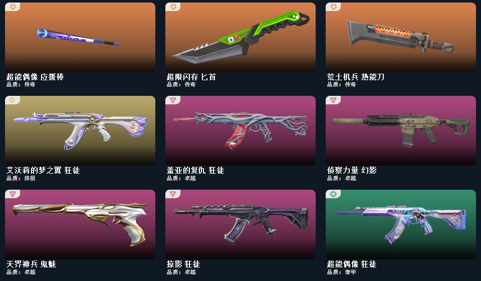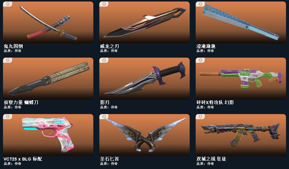 wegame无畏契约★侦察力量 蝴蝶刀,威龙之刃,剥皮小刀,荒土机兵 热能刀,澄湖潋滟,圣石匕首,鬼丸国纲,影刃,超限闪存 匕首,神圣领域 獠犬,神圣领域 幻影,月球哨兵 莽侠,神圣领域 战神,月球哨兵 正义