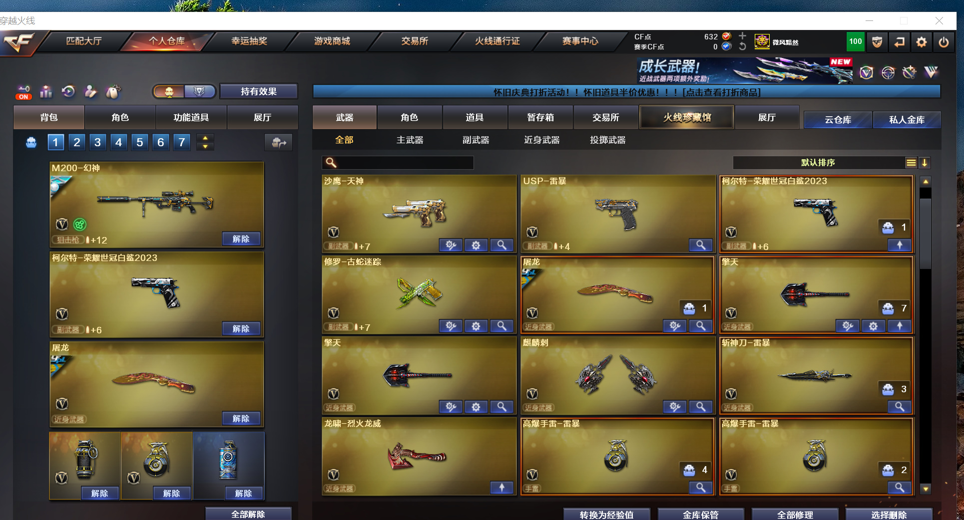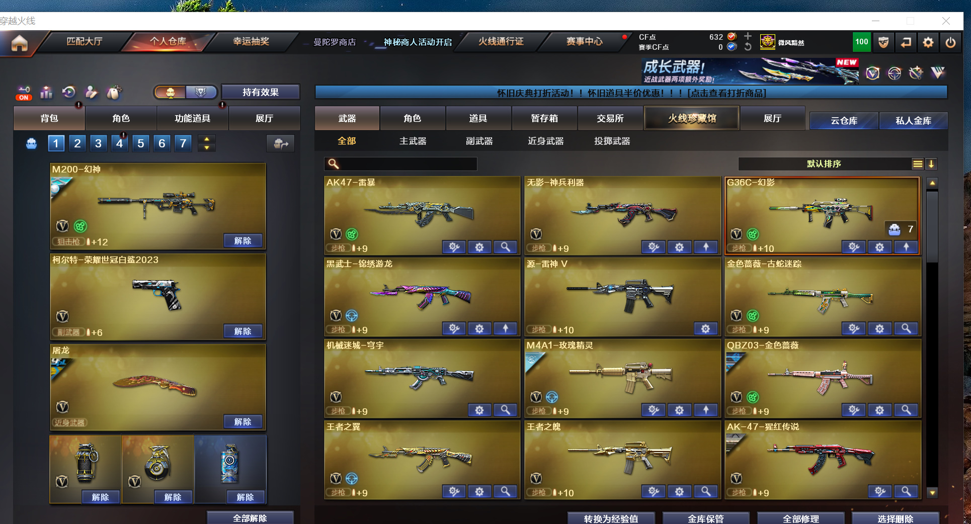 幻神星神音效卡幻神白鲨23电流G36幻影USP雷暴白鲨特量子蔷薇雷神毁灭黑骑3件套;USP-雷暴,柯尔特-荣耀世冠白鲨2023,RPK-盘龙,QBZ03-金色蔷薇,G36C-幻影,M200-幻神,Scar Light-白虎,