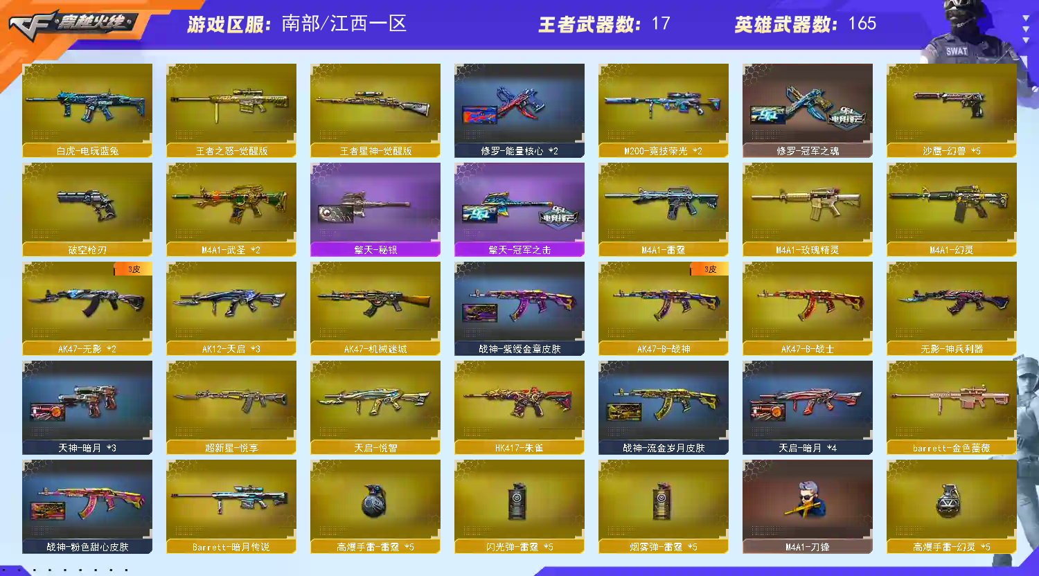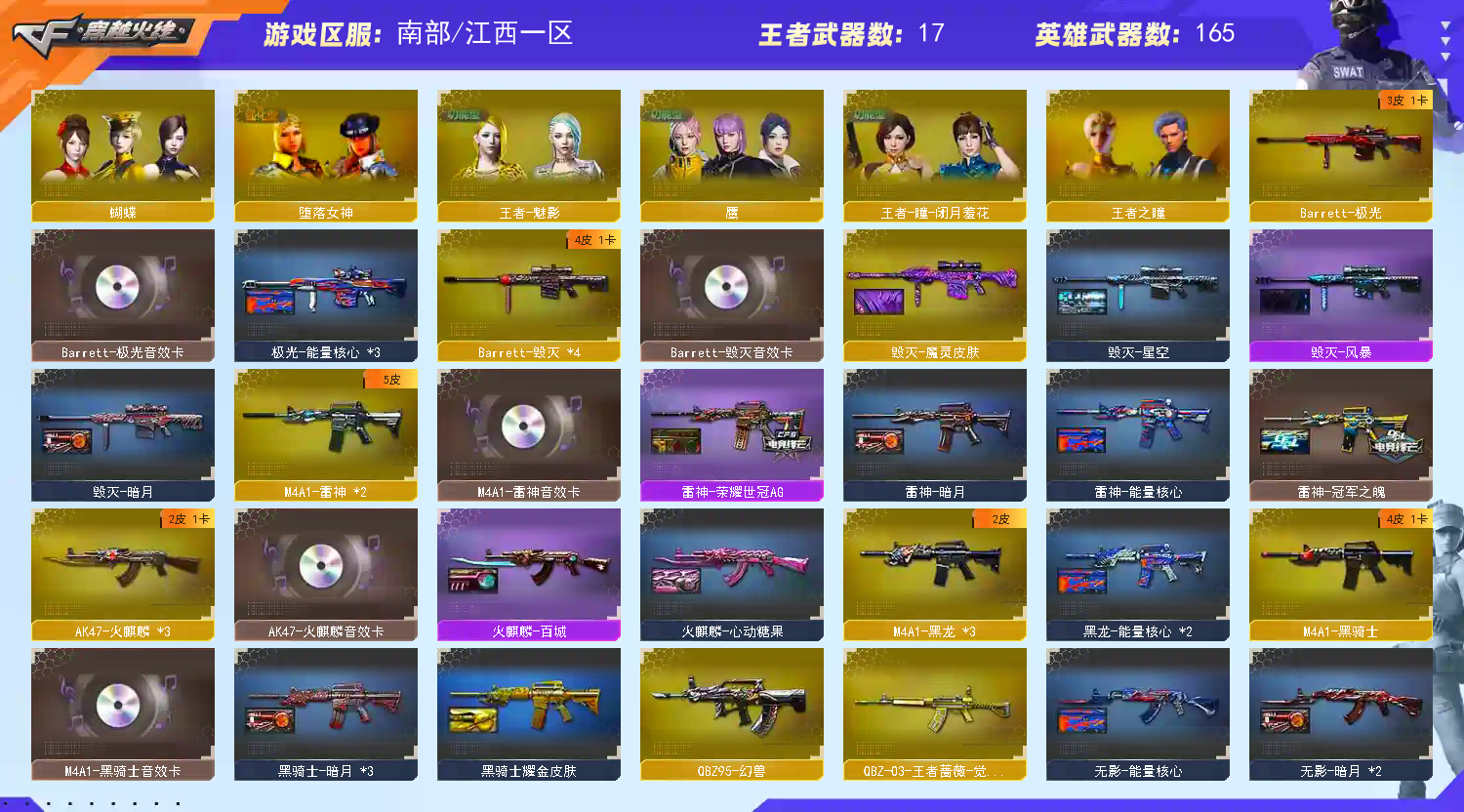 【传说暗裔+幻神三件套号】【传说暗裔】【幻神三件套】【6烈龙】【6加特林-炼狱】【毁灭三件套】【雷神3件套】【SCAR LIGHT-白虎三件套】【黑骑士三件套】【火麒麟三件套】【极光三件套】【M200-竞技荣光*2】【觉醒星神】【白虎-电玩蓝兔】【QBZ03-金色蔷薇】【觉醒qbz-03-王者蔷薇】【QBZ95-幻兽】【Knife-冠军之刃】【COP 357-雷霆】【USP-雷霆】【COP 357-幻灵*2】【觉醒王者之心/觉醒王者火魄/觉醒王者之魄/觉醒王者之势/觉醒王者之怒/觉醒王者之锋/王者之瞳/王者魅影/王者-瞳-闭月羞花/王者-春】【柯尔特-竞技荣光*3】【幻神2皮肤/青鹤皮肤+周瑜皮肤】【qbz-金色蔷薇-冠军之薇皮肤】【烈龙星空皮肤】【黑骑士3皮肤/白马银枪皮肤+暗月皮肤*3+耀金皮肤】【巴雷特-极光能量核心皮肤*3】【毁灭5皮肤/魔灵皮肤+风暴皮肤暗月皮肤CF2018皮肤+星空皮肤】【擎天-冠军之击皮肤+擎天秘银皮肤】【黑龙能量核心皮肤*2】【awm天龙2皮肤/CF STAR皮肤+传奇 70KG皮肤】【ak47-无影2皮肤+能量核心皮肤+暗月皮肤*2】【天启-暗月皮肤*4】【雷神4皮肤/荣耀世冠AG皮肤+暗月皮肤+能量核心皮肤+冠军之魄皮肤】【火麒麟6皮肤+-百城皮肤CF STAR皮肤*2+CF2018皮肤+AG战队皮肤+雷神皮肤+心动糖果皮肤】【沙鹰-修罗4皮肤/CF STAR皮肤*2+能量核心皮肤*2+CF2018皮肤+冠军之魂皮肤】【沙鹰-天神暗月皮肤*3】【荣耀世冠-柯尔特】【雷神-小红】【黄金小号】【ak47火麒麟*3】【m4a1-黑龙*3】【m4a1-雷神*2】【m4a1-黑骑士】【ak47-无影*2】【ma41-死神】【ak12-天启*3】【m4a1-武圣*2】【ak47-机械迷城】【m4a1-龙血*5】【m4a1-雷霆】【hk417-朱雀】【m4a1-幻灵】【无影-神兵利器】【m4a1-玫瑰精灵】【m4a1-猎神】【ak47-b-战士】【ak47-b-战神】【awm-天龙*2】【巴雷特-毁灭*4】【巴雷特-极光】【巴雷特-雷霆】【巴雷特-金色蔷薇】【巴雷特-暗月传说】【盘龙】【炼狱-风暴】【炼狱-悦蓝】【炼狱-惊涛骇浪】【aa-12-雷霆】【沙鹰-修罗*4】【沙鹰-天神*4】【Giock18-武圣*2】【破空枪刃】【沙鹰-幻兽*5】【屠龙*3】【龙啸】【擎天】【麒麟刺*3】【尼泊尔-雷霆】【马来剑-夜魔】【幻灵之锋】【擎天-竞技荣光】【女皇利刃-幻兽】【龙啸-烈火龙威】【雷霆手雷包*5】【幻灵手雷包*5】【夜魔手雷包】【幻兽手雷包*5】【竞技荣光手雷包*4】【电竞教官-云悠悠】【蝴蝶】【葵】【樱】【鹰】【影豹】【炫】【堕落女神】【修道士】【暗夜-x/奥摩-x/飞狐-x/救世主-x/灵狐者-x/潘多拉-x/斯沃特-x/夜玫瑰-x/影舞者-x/】【初恋影虎/芳心审判者/风暴女/虎妞/嘉年华灵狐/娟娟/龙儿-小淘气/麻雀/木兰/女战神/潘多拉-甜心教官/青霞仙子/邱刚敖/社长刀锋/蜀雪/铁骑荣耀/兔团团/新猎狐者/新娜塔莎/雪莉杨/职业选手】【AG战队炫彩背包/R.LGD炫彩背包/XROCK炫彩背包/超级背包/虎牙炫彩背包/炫彩背包】【AC/手雷包/c4钳永久】玩偶光效一堆;USP-雷暴,荣耀世冠-柯尔特,Knife-冠军之刃,电竞教官-云悠悠,RPK-盘龙,QBZ03-金色蔷薇,M200-幻神,