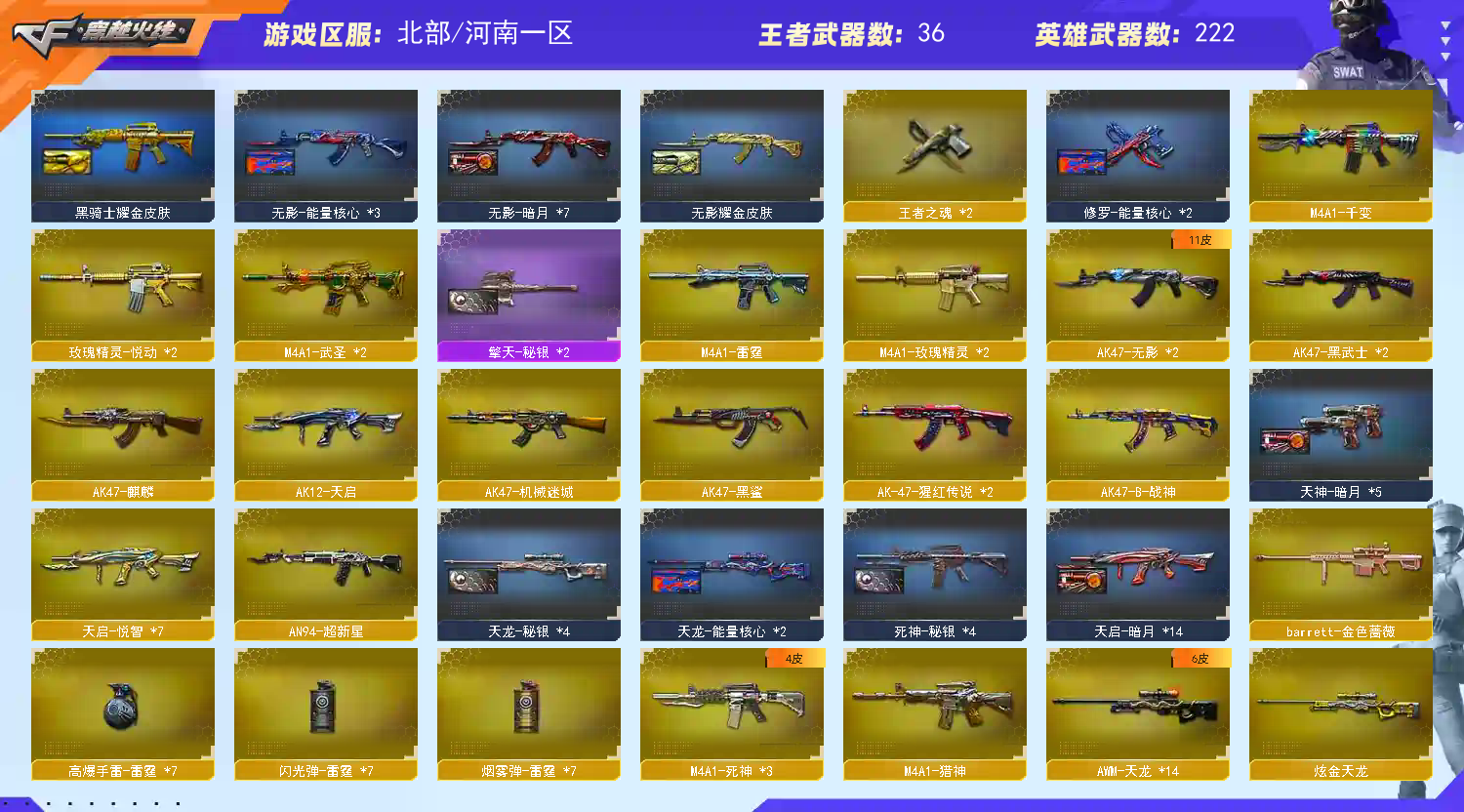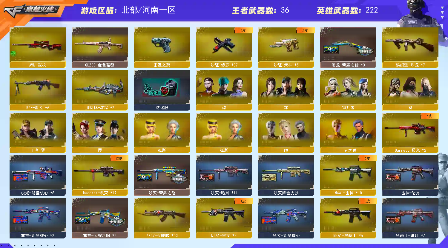 240V可排位丨30王者11炫金丨6烈龙6盘龙6屠龙丨荣耀之锋之魄之怒丨全CFS丨毁灭-CFS2018丨修罗-CFS2018丨火麒麟-AG战队丨M37葵丨COP-旗袍丨雷霆套丨堕天神3套丨63*36狙击8*7*44副武器34近身丨透明套;RPK-盘龙,QBZ03-金色蔷薇,