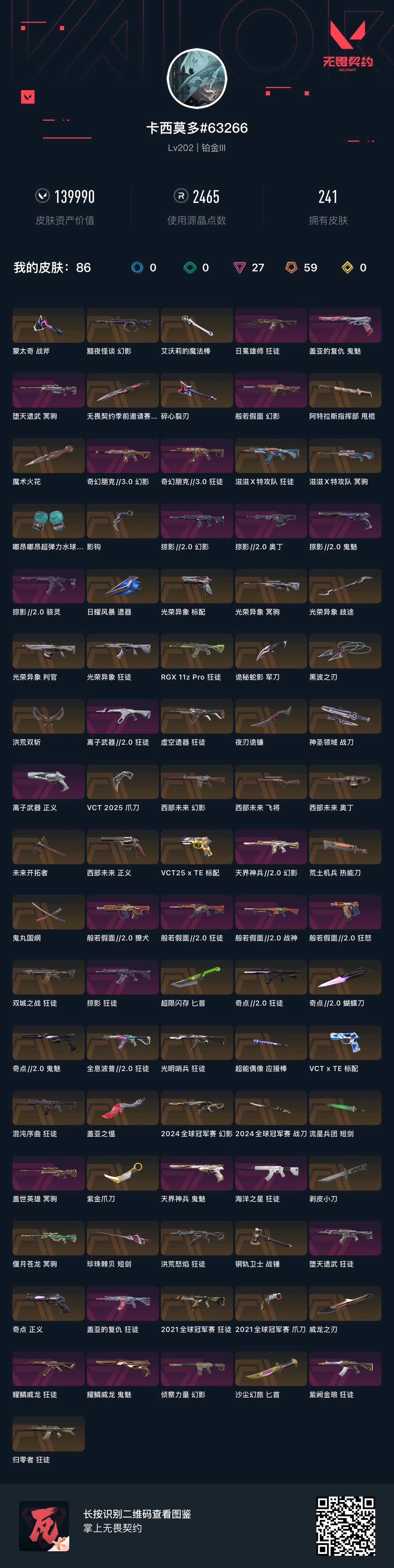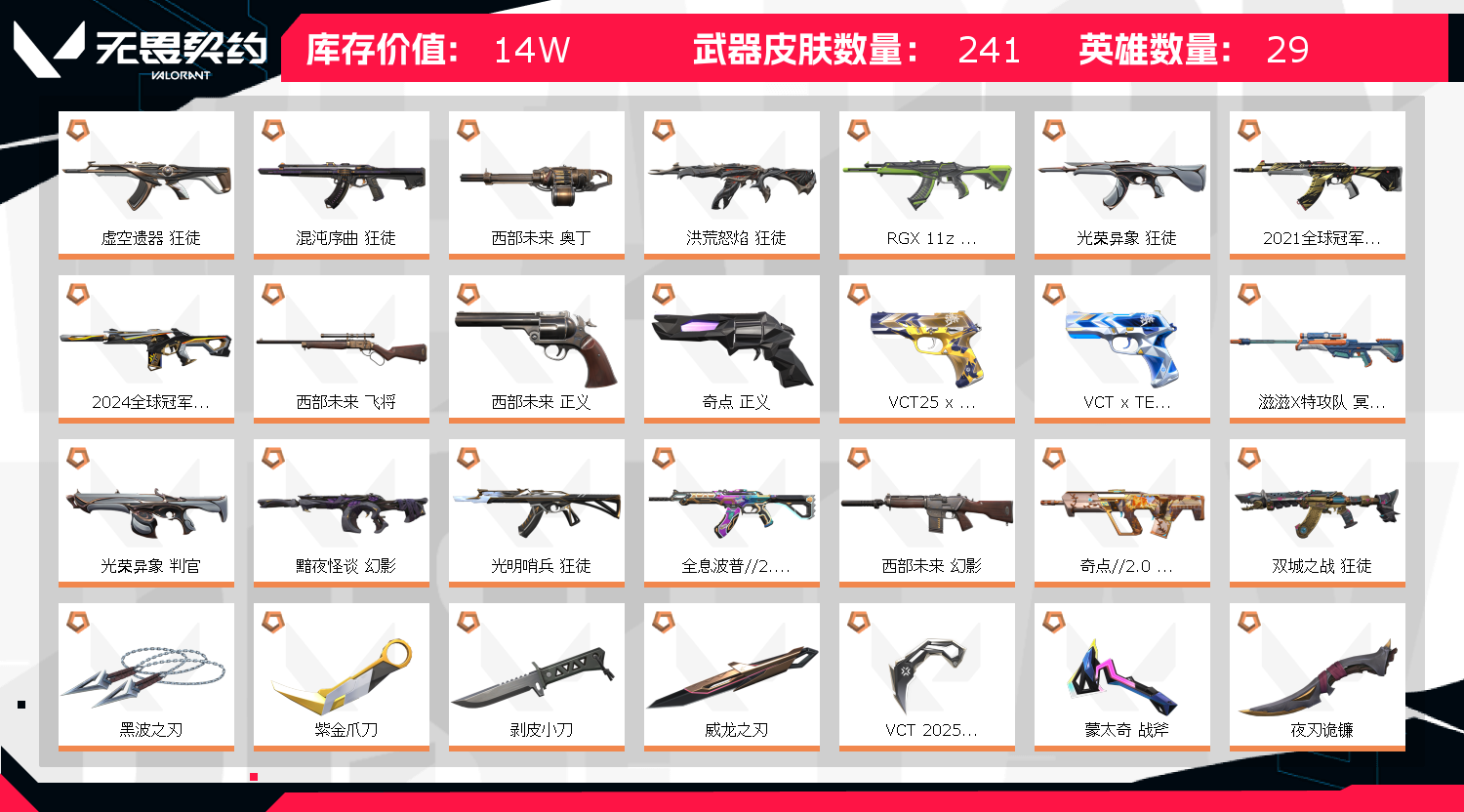 可排位 英雄28 武器皮肤数量224;西部未来 奥丁,黑波之刃,紫金爪刀,剥皮小刀,威龙之刃,VCT 2025 爪刀,天界神兵//2.0 幻影,