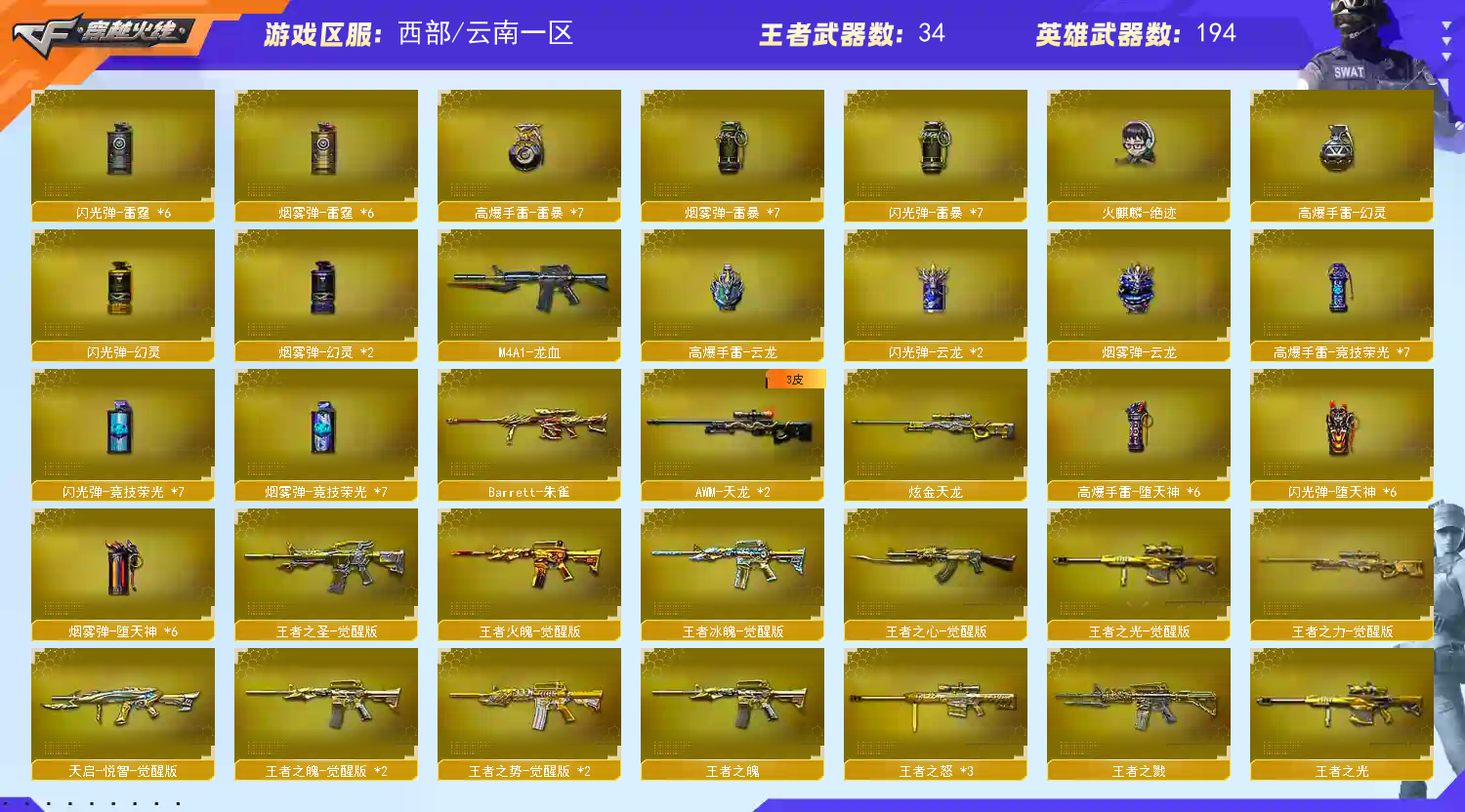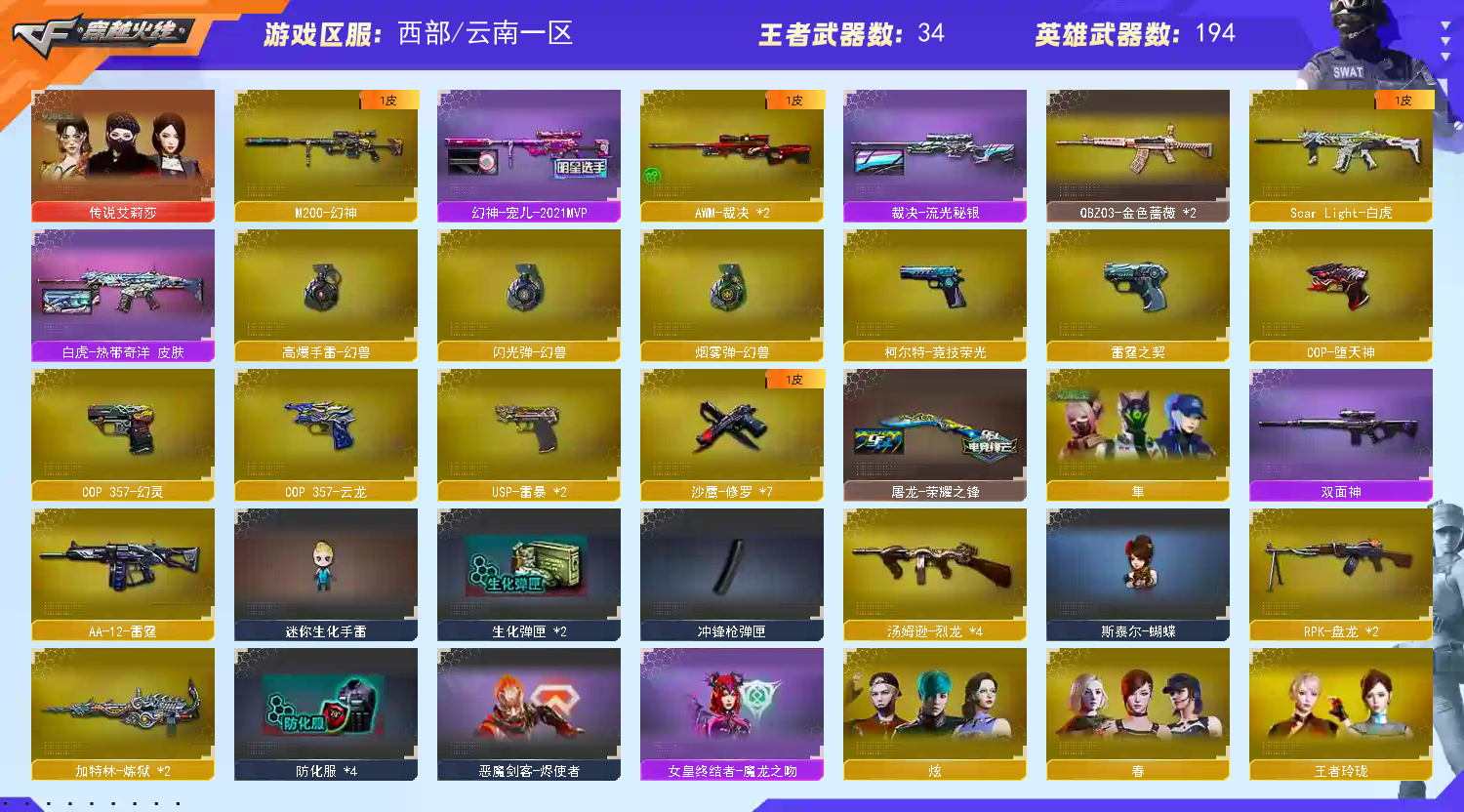 如遇上号困难 麻烦私聊发信息解除在玩 恶意开挂,开鼠标宏,开DMA导致账号封禁者,本店将起诉之法院索赔 王者冰魄 王者火魄 王者风吟 雷霆套全套 堕天使套全套 竞技荣光全套 雷暴全套 热门武器都有;USP-雷暴,隼,电竞教官-云悠悠,传说艾莉莎,RPK-盘龙,QBZ03-金色蔷薇,M200-幻神,
