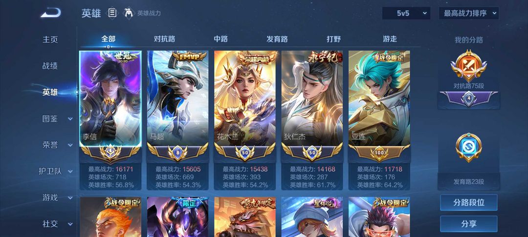 正式服历史国服李信马超木兰狄仁杰⭐75段对抗路⭐v10贵族皮肤共享⭐可排位