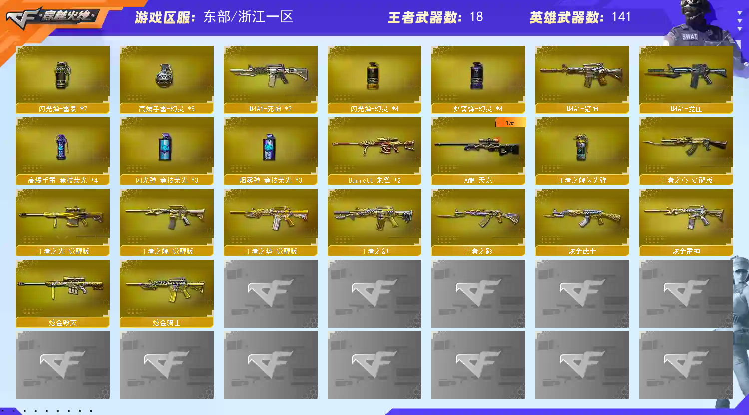 首页 > 租号大厅 > 穿越火线 > 电信区/浙江一区 > 【m200幻神+AGCFpls24冠军皮肤+冠军之幻皮肤+黄忠皮肤+幻神音效卡】【98k星神】