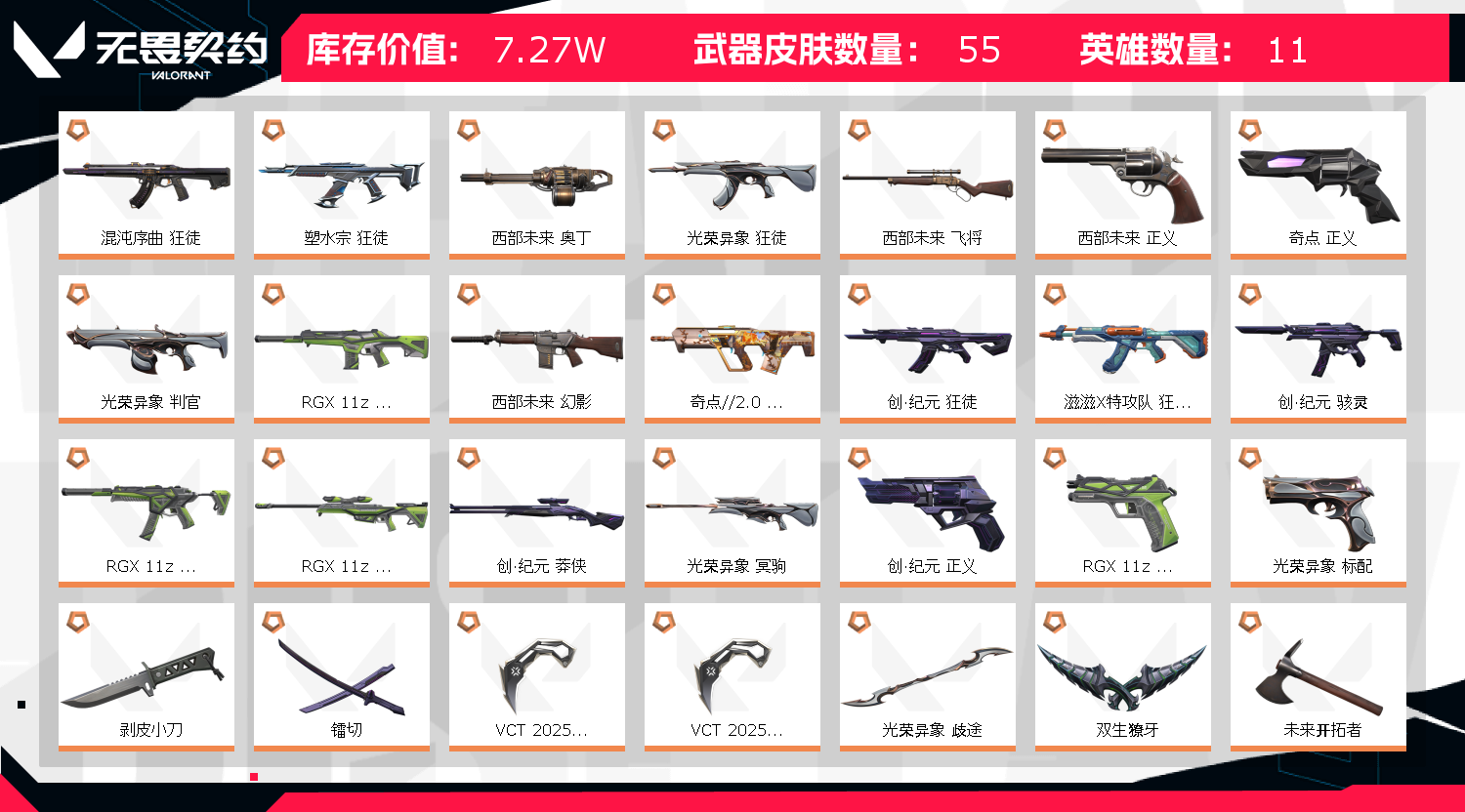 1;西部未来 奥丁,剥皮小刀,镭切,VCT 2025 爪刀,盖亚的复仇 狂徒,异鳞魔蛇 幻影,紫阙金琅 狂徒,